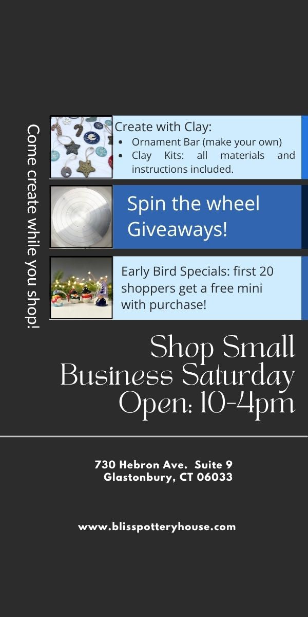 Come to the studio on Saturday, November 29th from 10-4pm to Create, Sip and Shop! We'll have lots of activities for all ages. As well as a hot cocoa bar (and coffee & tea) with yummy treats to snack on.