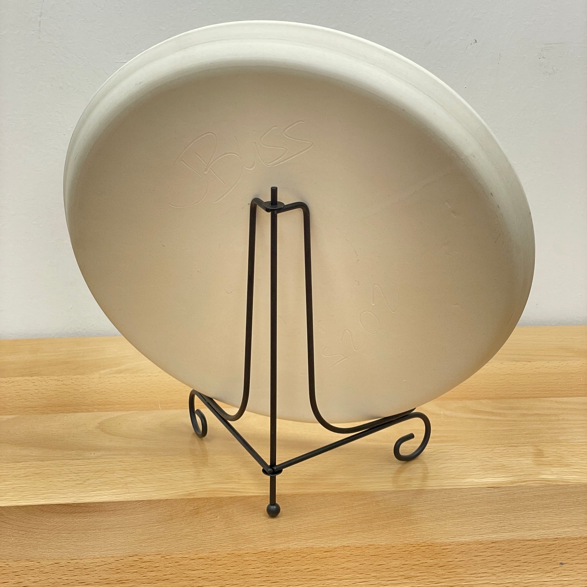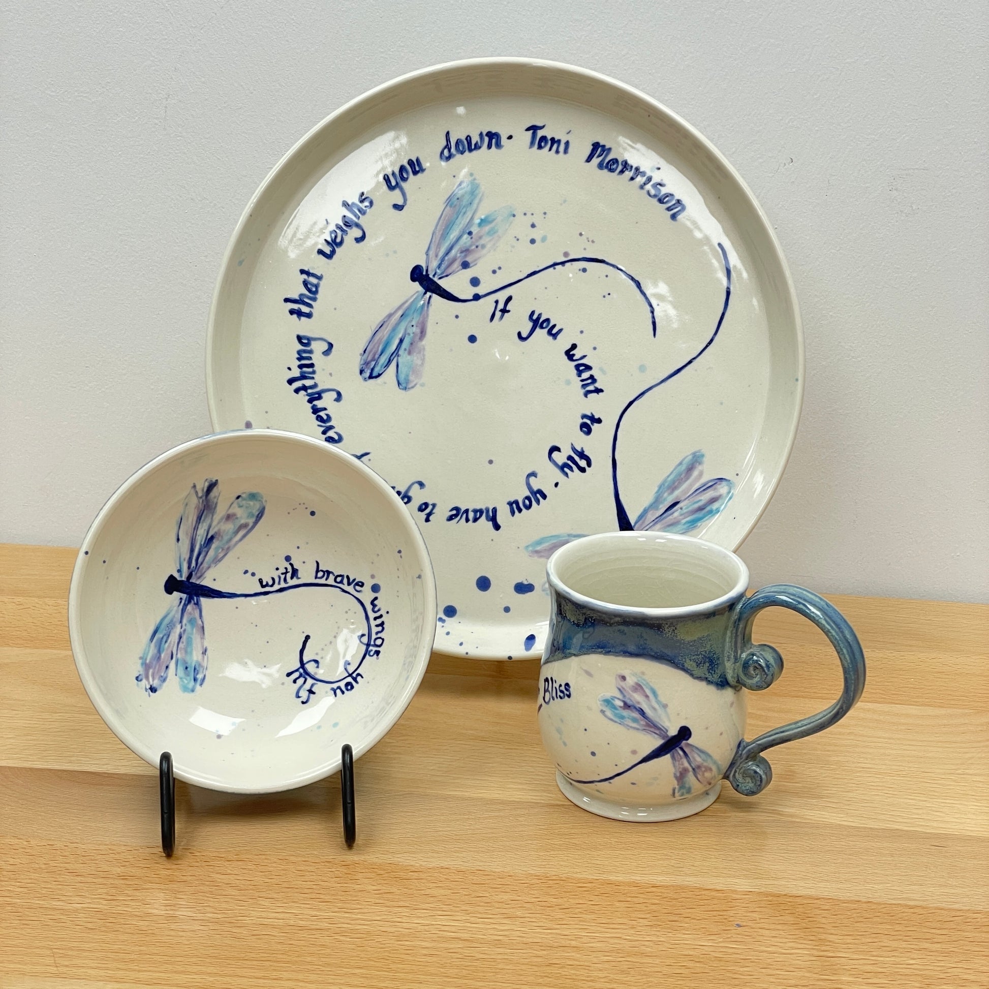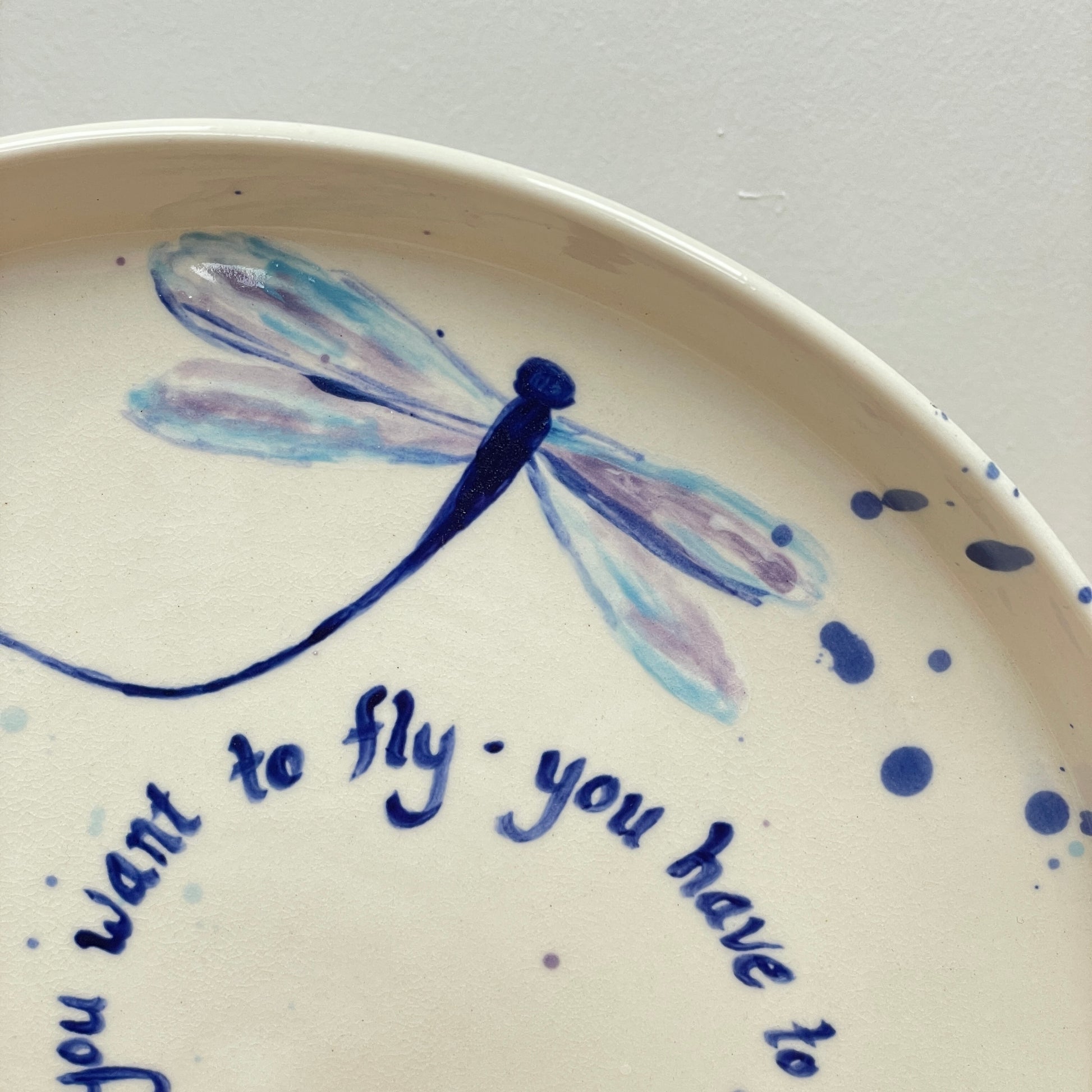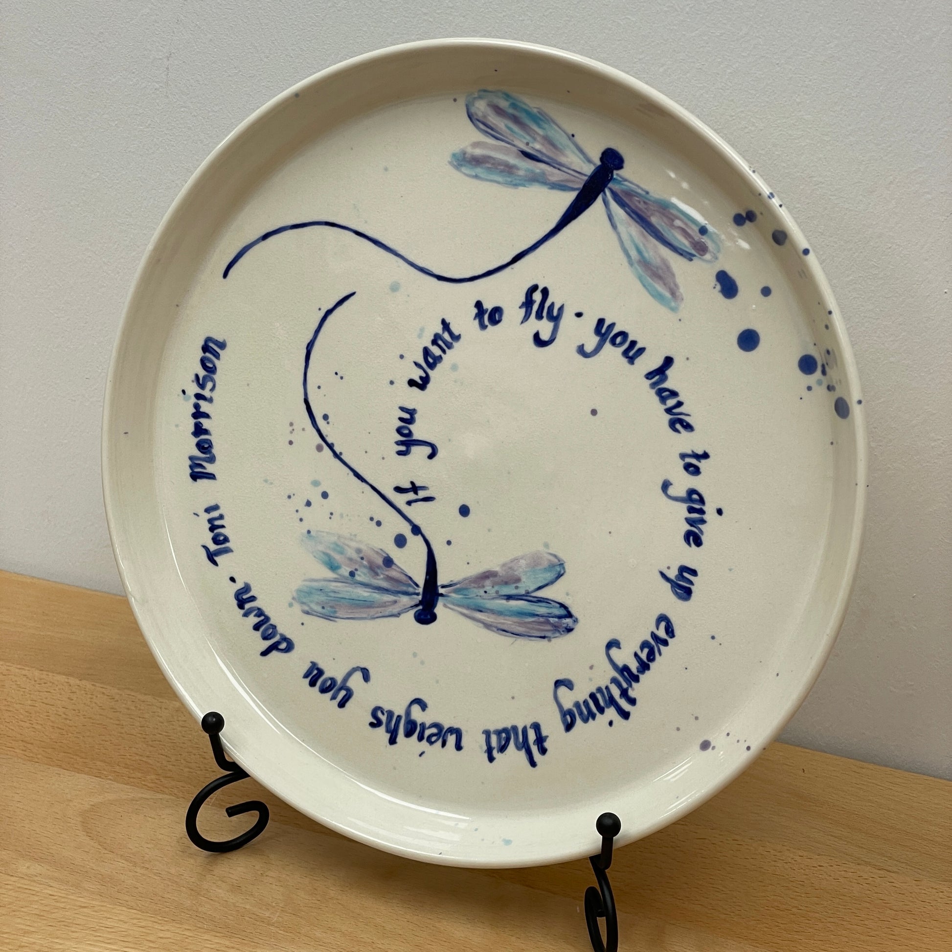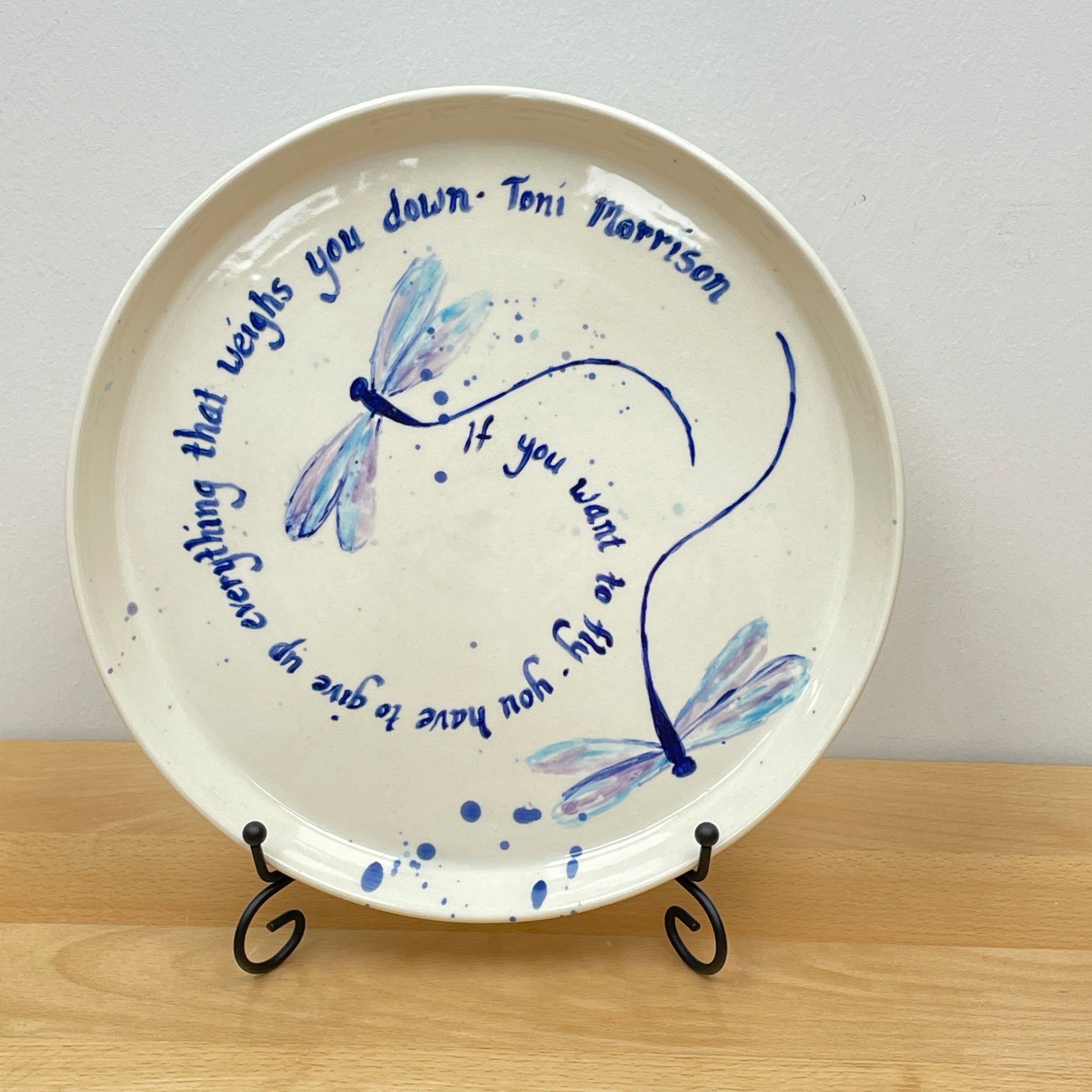 This plate was made on the potters wheel using porcelain clay. Once it was leather-hard, it was trimmed and then bisque-fired. The dragonflies and quote was hand-painted with underglaze, and then once dry, it was glazed over in a clear glaze. Then it was fired once more to this finished product.