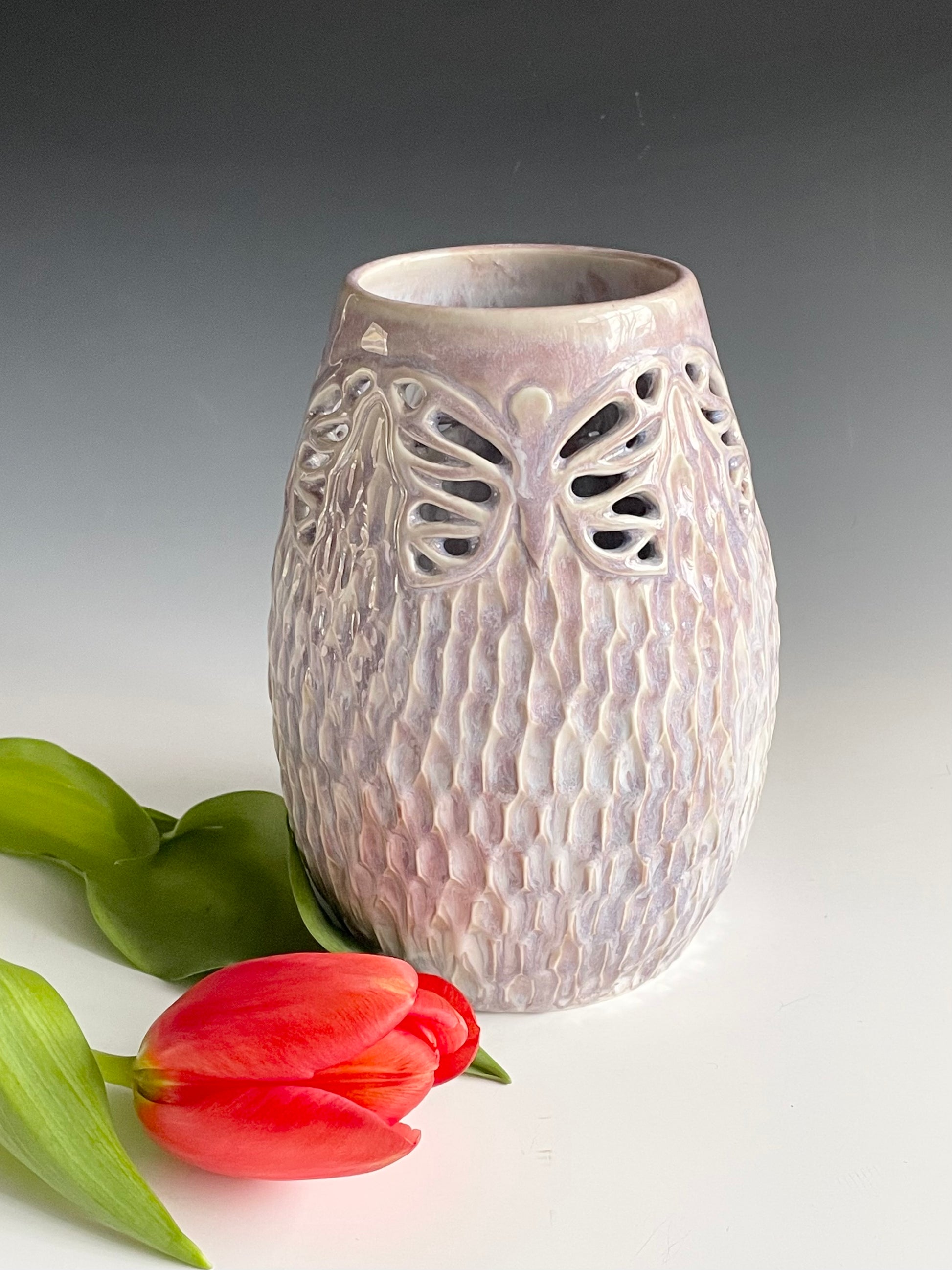 This vase was made on the potters wheel using porcelain clay. Once it was leather-hard, it was trimmed and the butterflies were planned and intricately pierced and meticulously refined so there are no sharp edges. Then, the rest of the vase was hand-carved. It was bisque-fired and then glazed in this lilac color just in time for spring! It was fired once more to this finished product.
