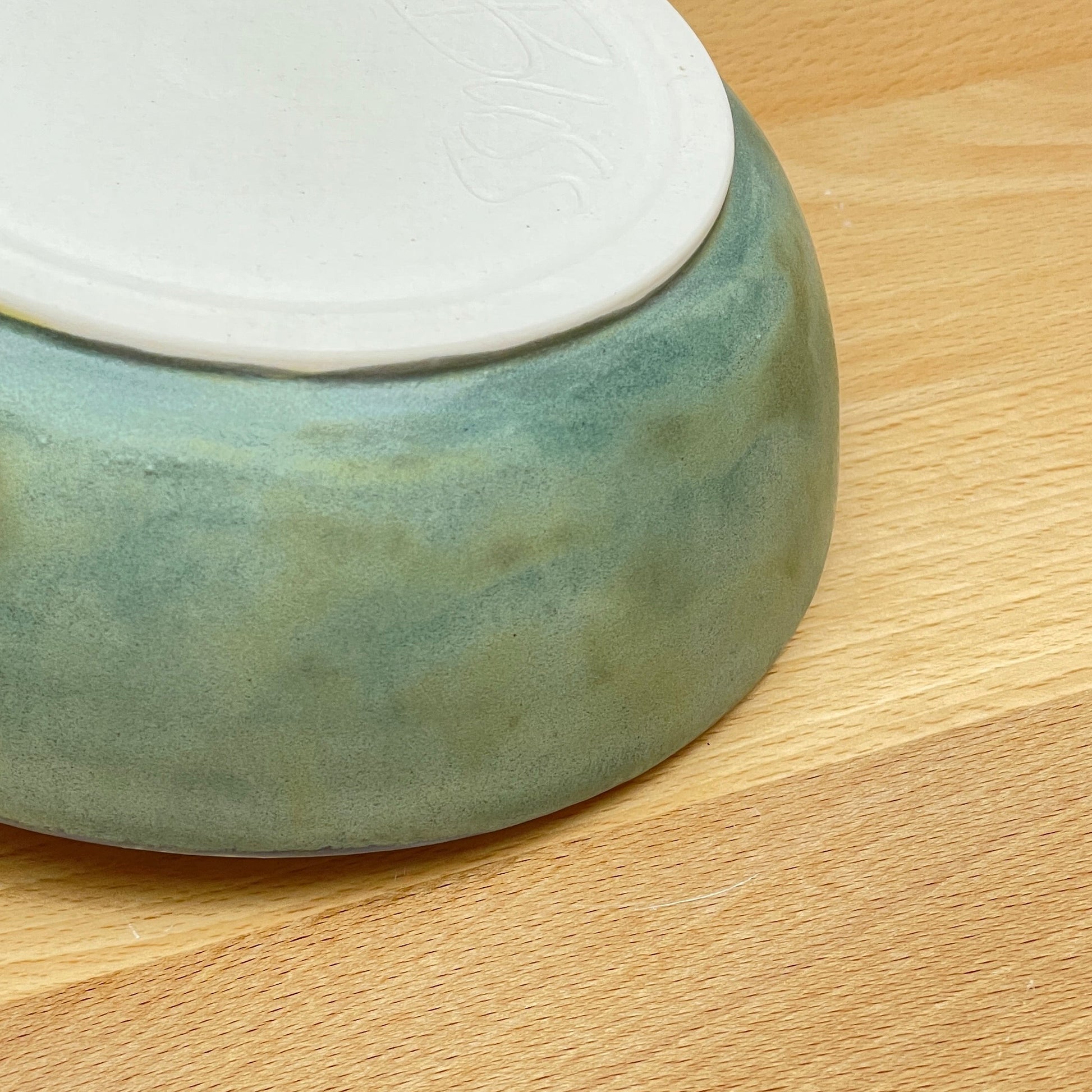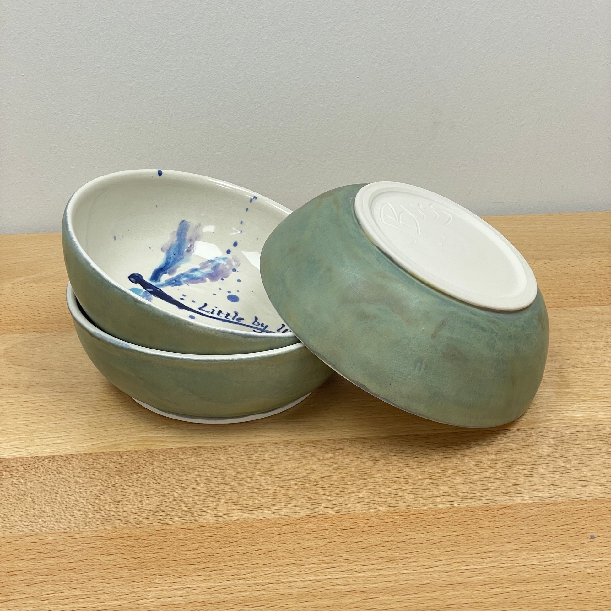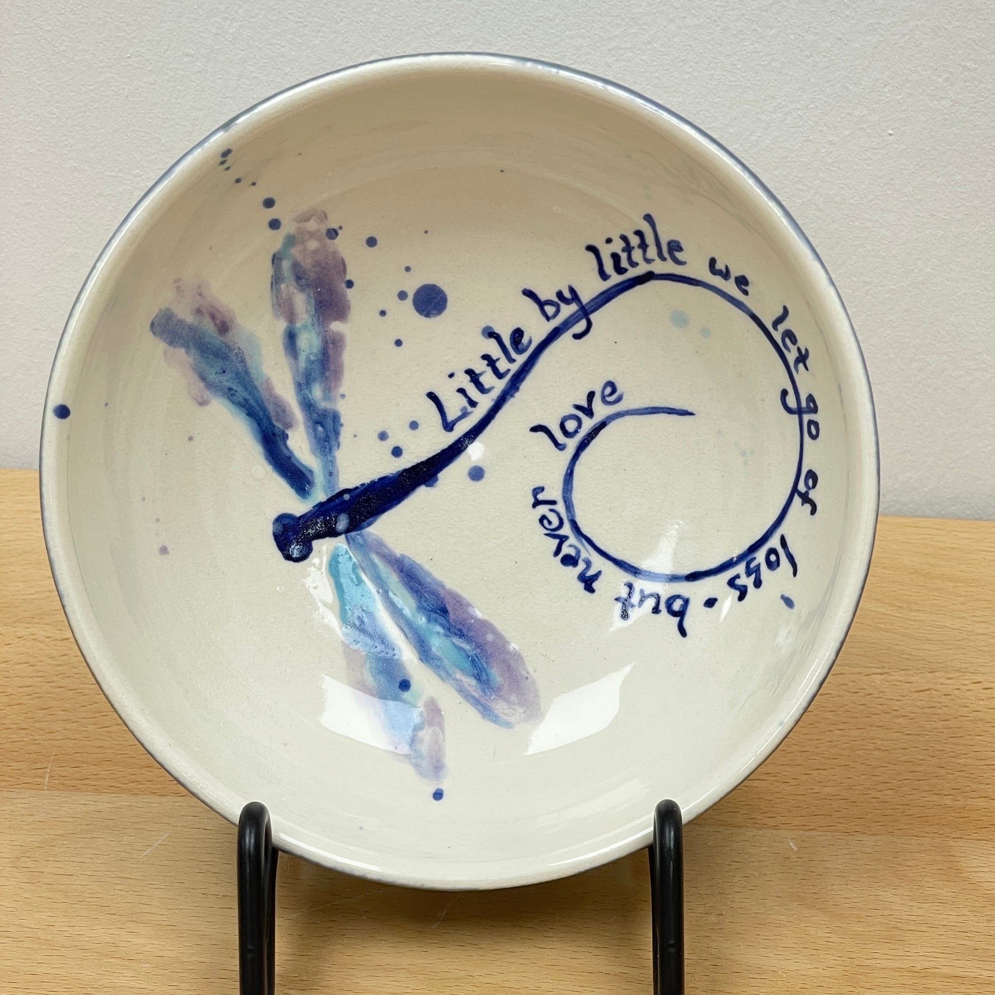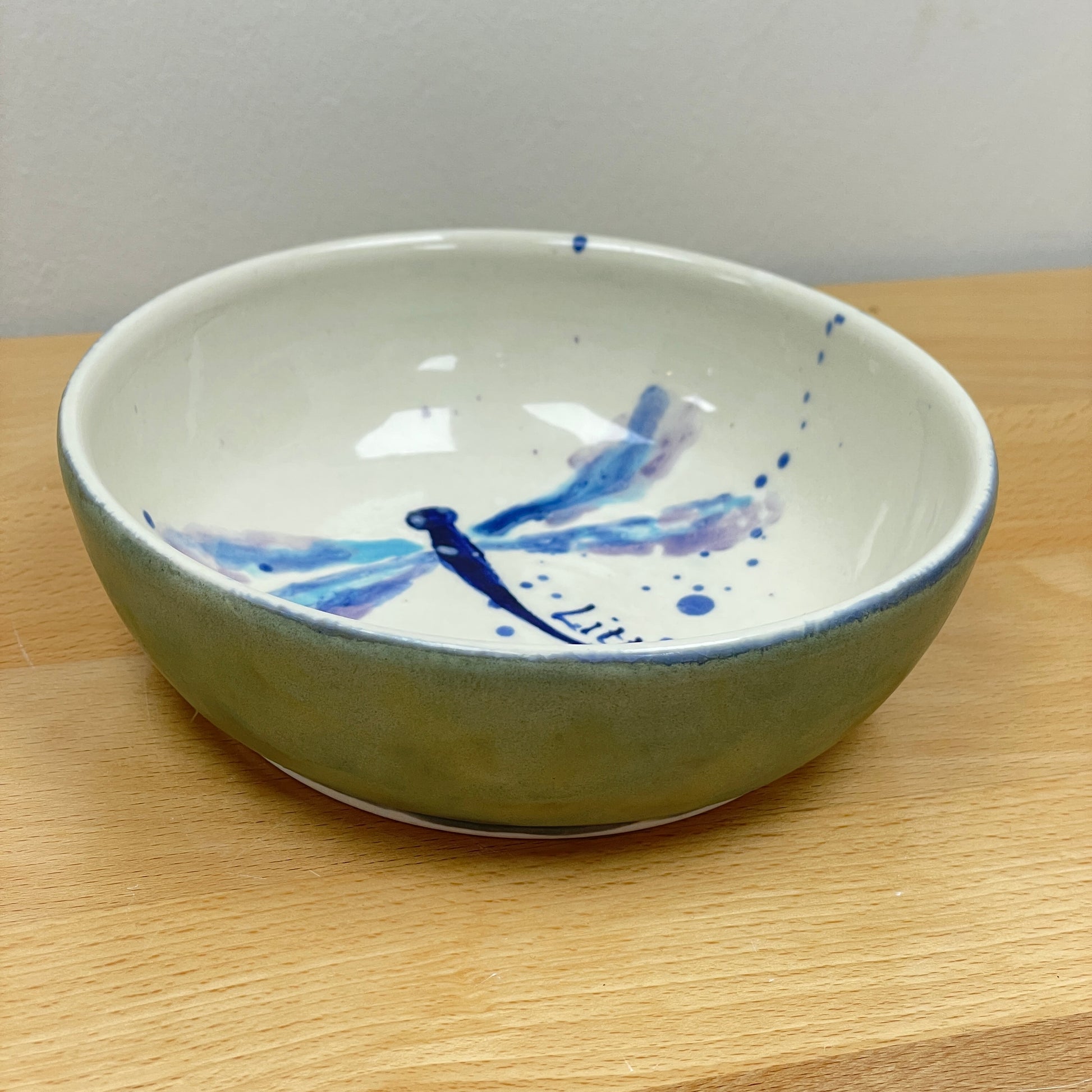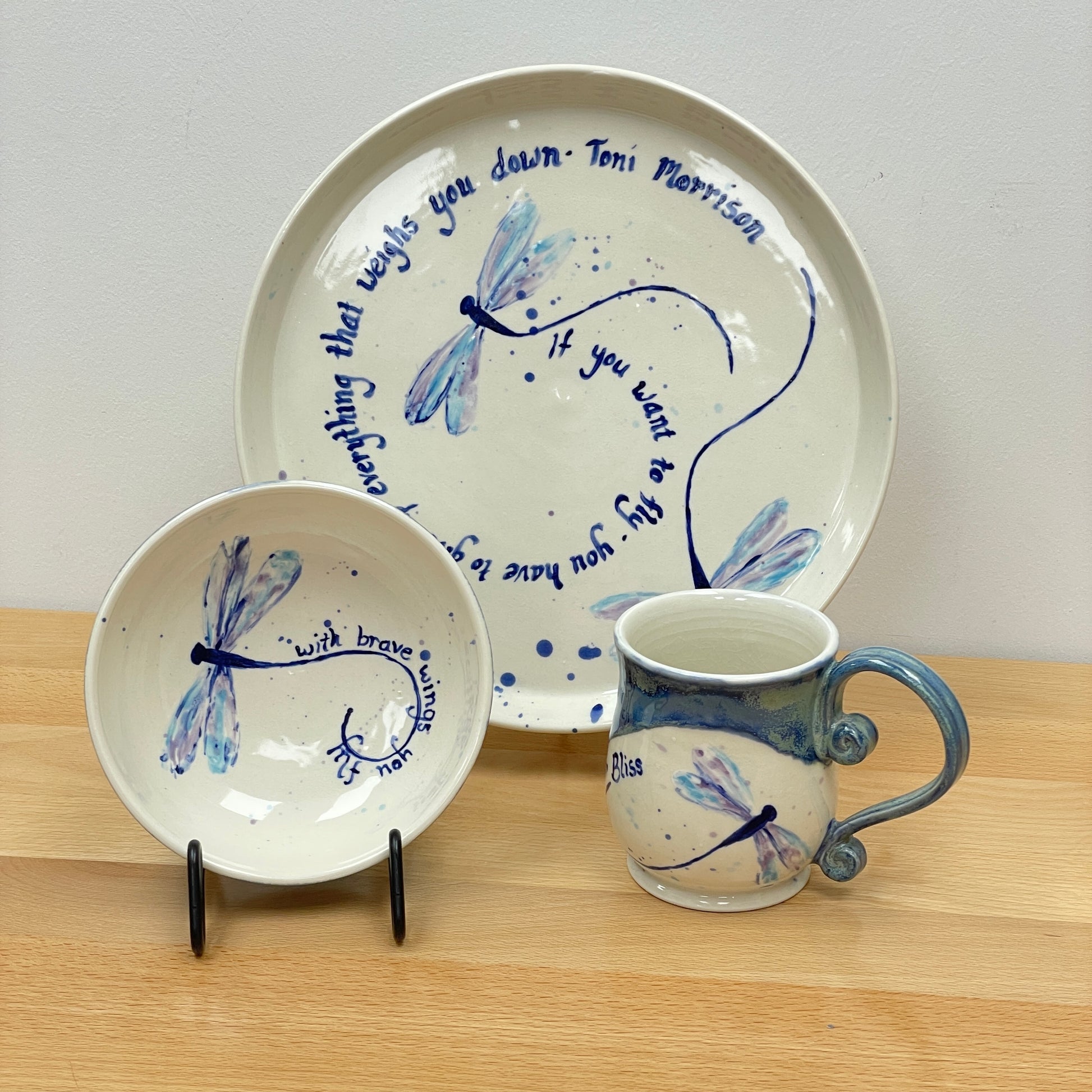 This bowl was made on the potters wheel using porcelain clay. Once it was leather-hard, it was trimmed and then bisque-fired. The dragonfly and quote was hand-painted with underglaze, and then once dry, it was glazed over in a clear glaze. The side of the bowl was glazed in a blue-green color and then it was fired once more to this finished product.
