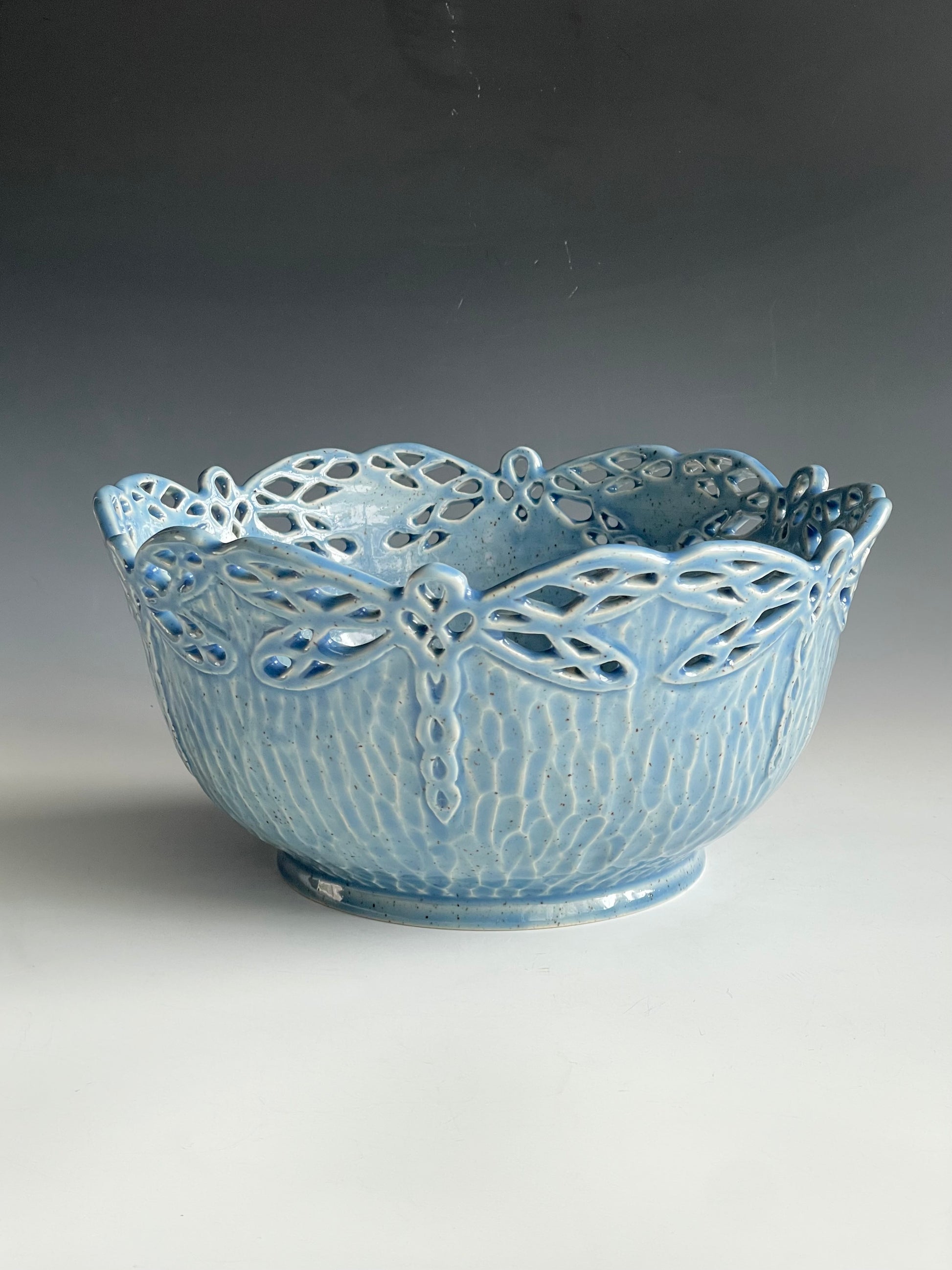 This serving bowl was made on the potters wheel using speckled stoneware clay. Once it was leather-hard, it was trimmed and the dragonflies were planned and intricately pierced and meticulously refined so there are no sharp edges. Then, the rest of the bowl was hand-carved. It was bisque-fired and then glazed in light blue color. It was fired once more to this finished product.