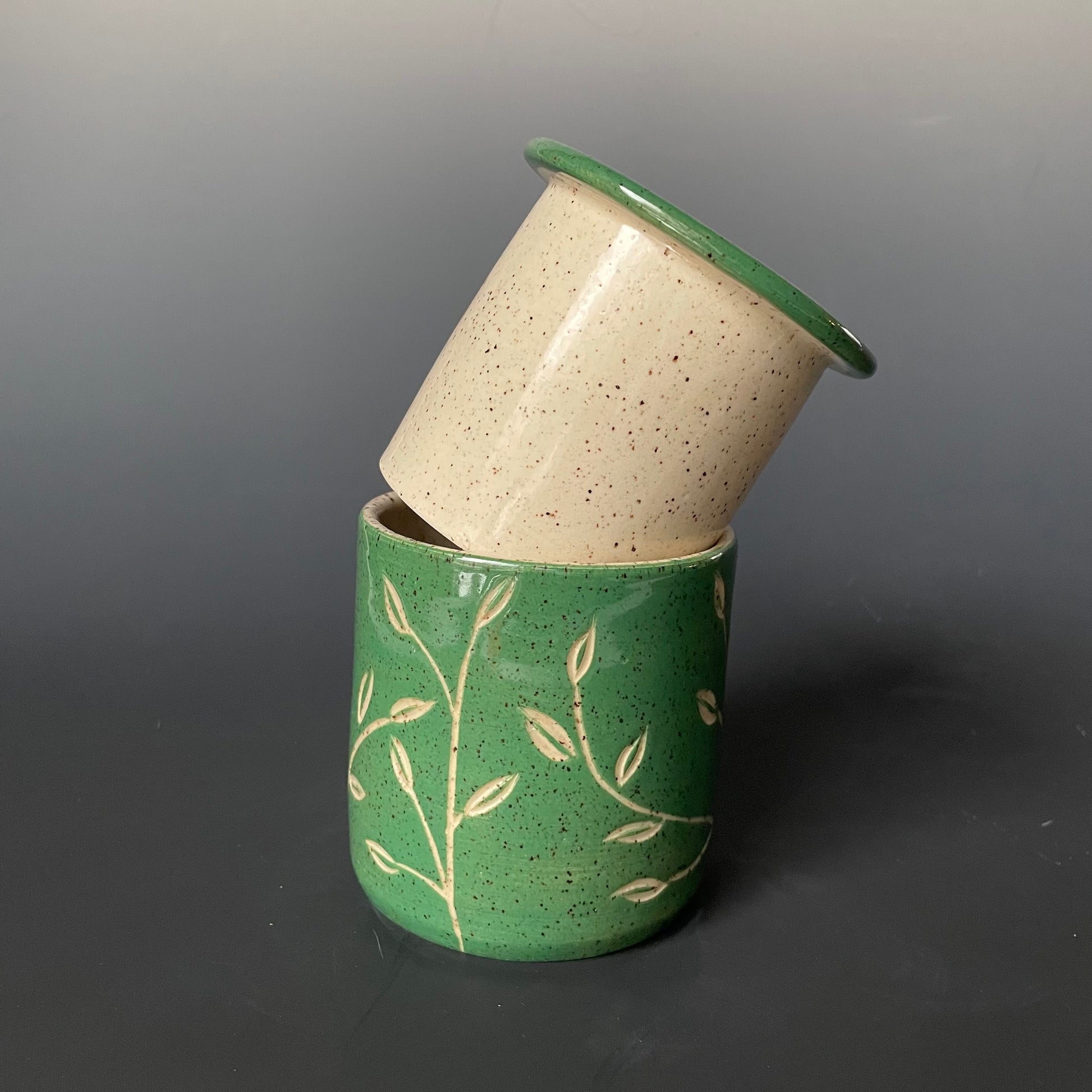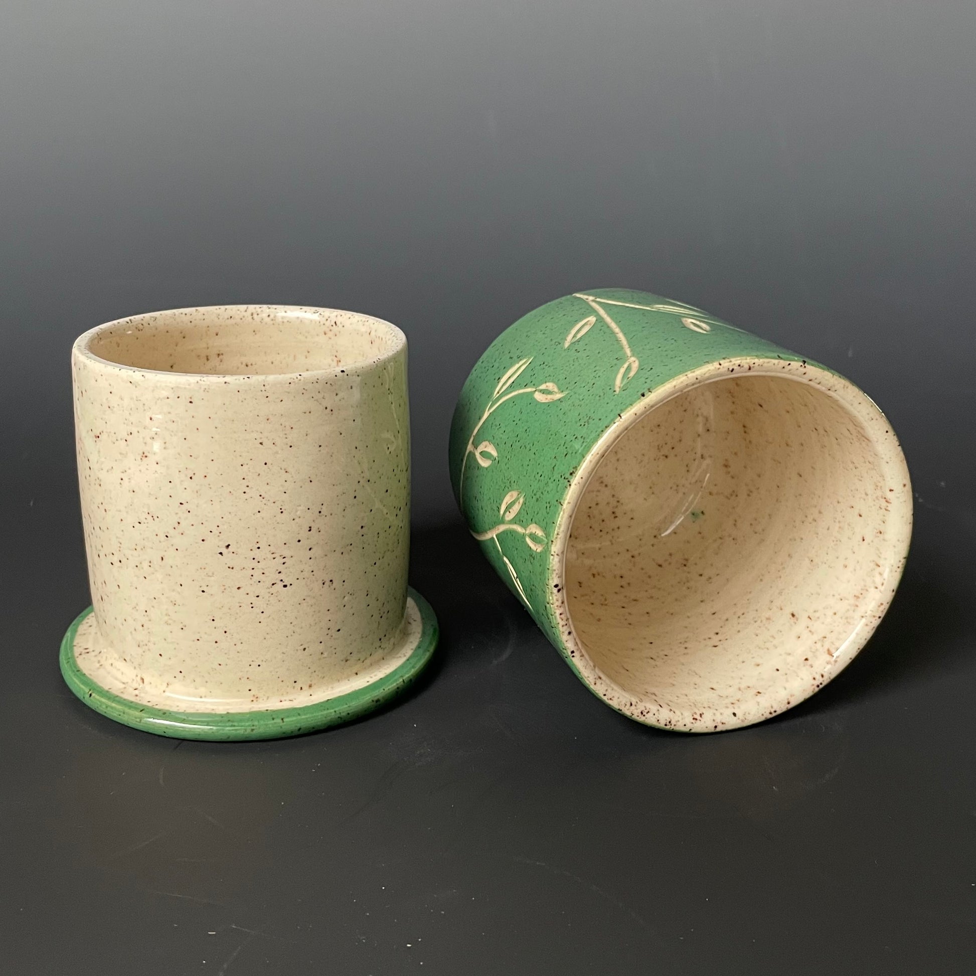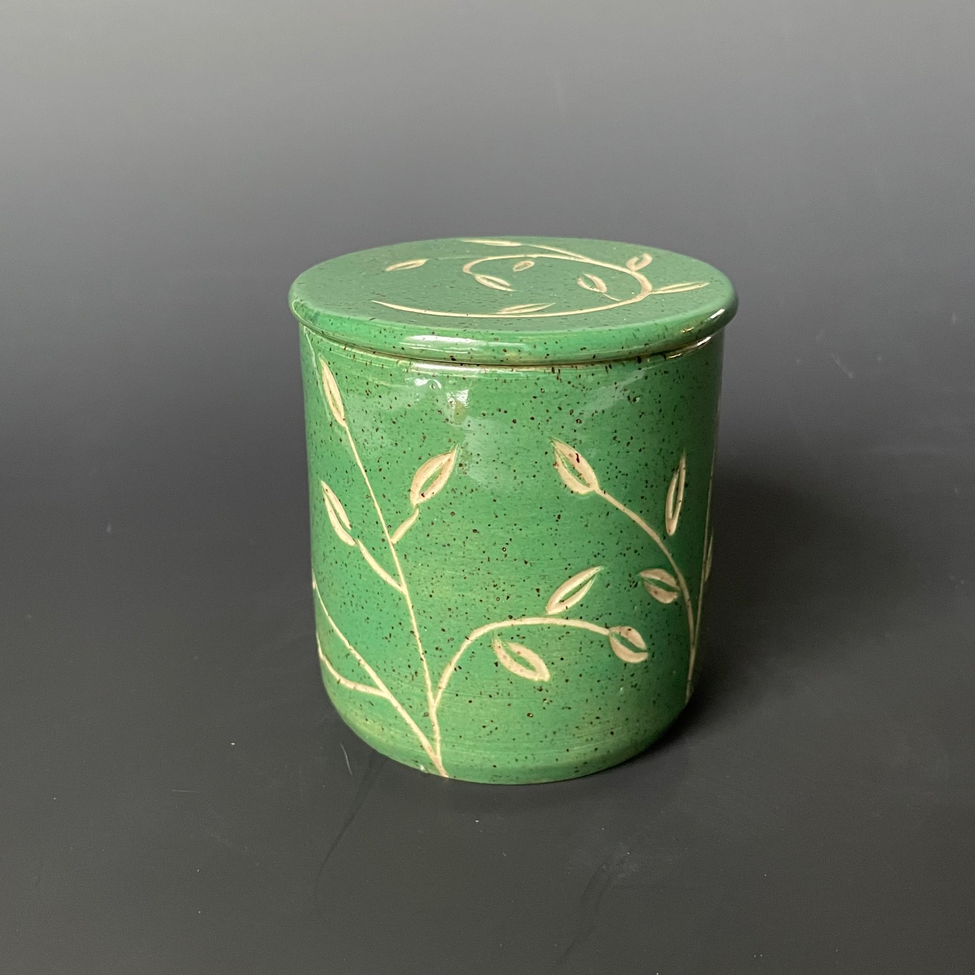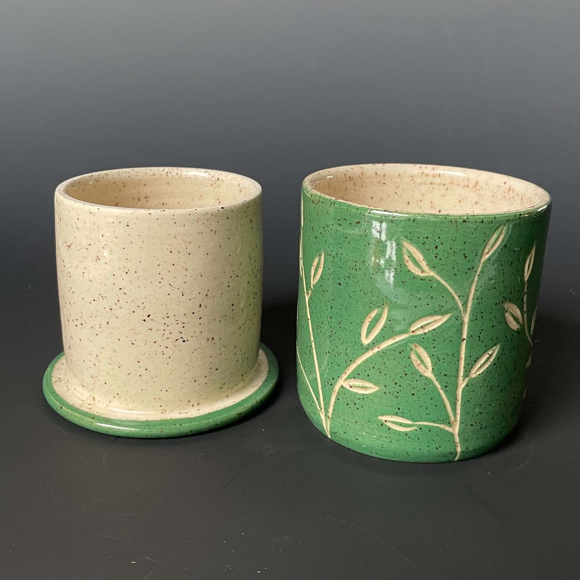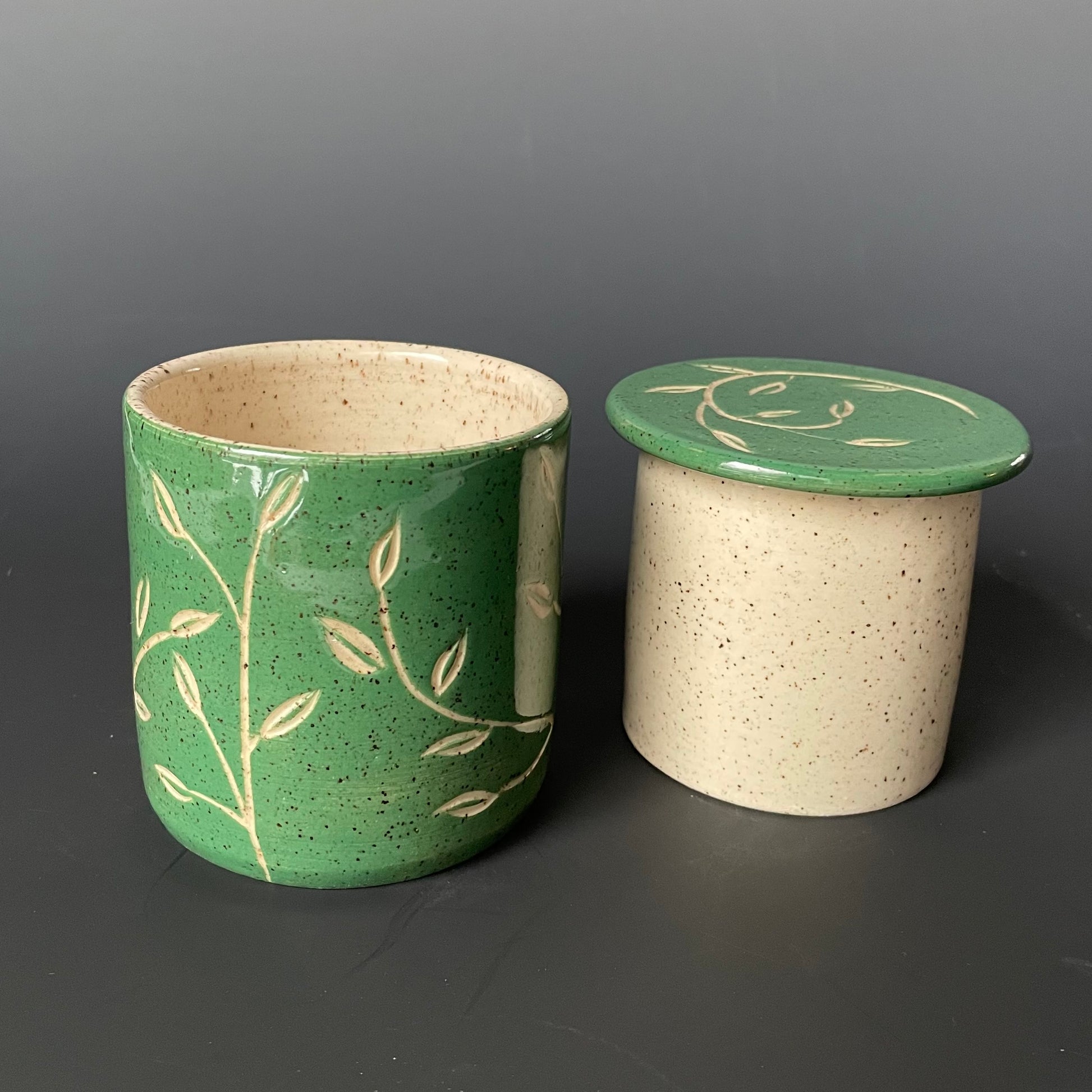 This butter keeper has two parts; both parts were thrown on the potters wheel. Then, once they were leather-hard, both were trimmed and the green underglaze was painted on. The leaf design was then carefully carved into the clay and once it was dry, it was fired. Then a clear glaze was applied and fired again to this finished product.