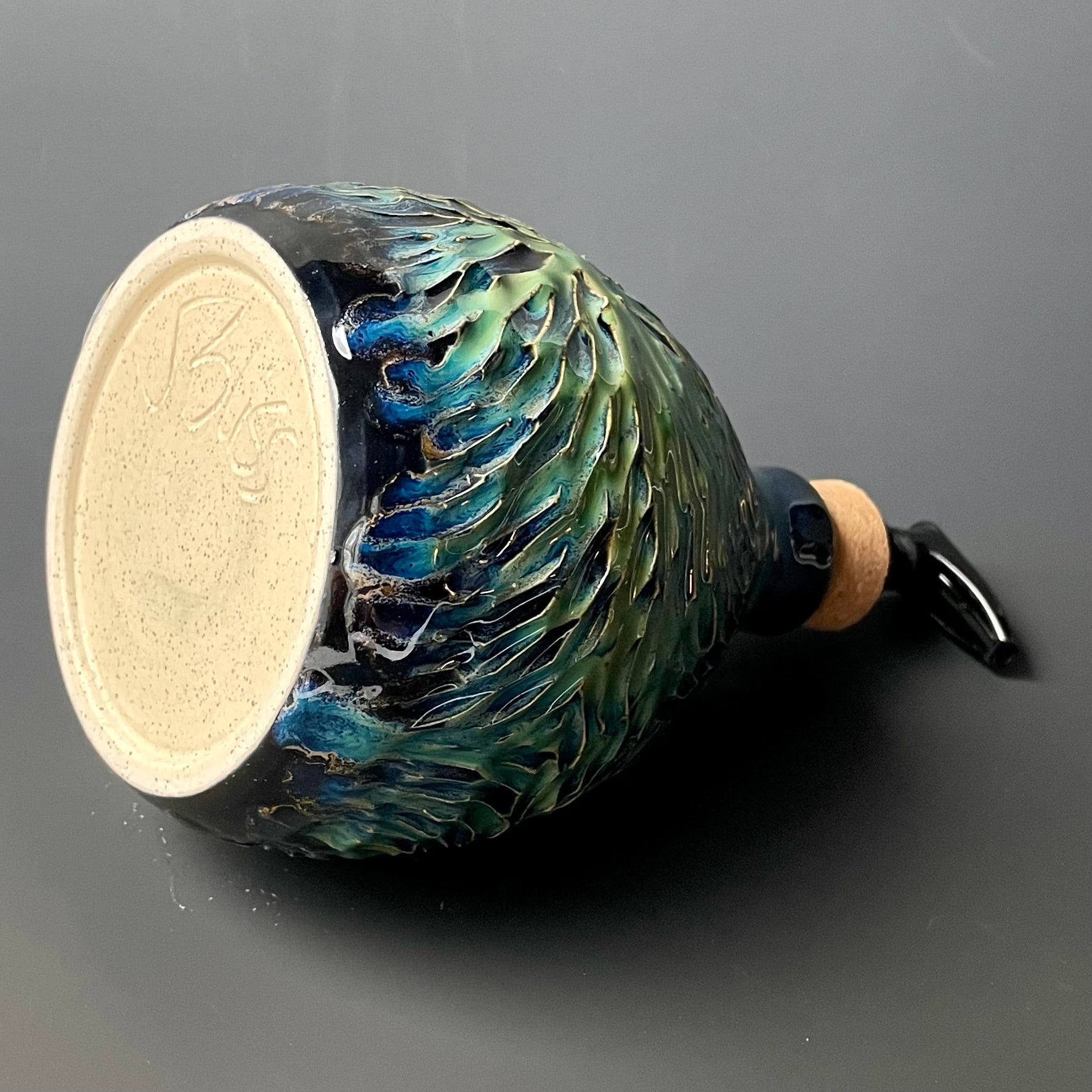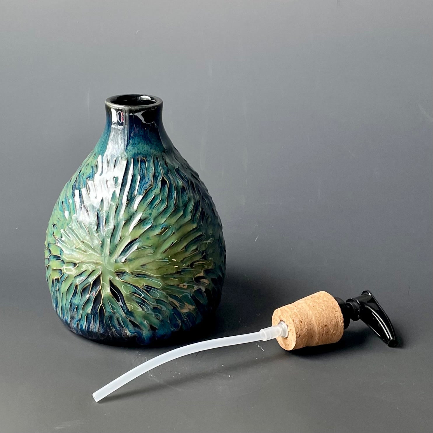 This dispenser was made on the potter's wheel out of speckled stoneware. Once it was leather hard, it was trimmed and the burst pattern was carefully carved into the clay. It was fired once, glazed and then fired again for this finished product.