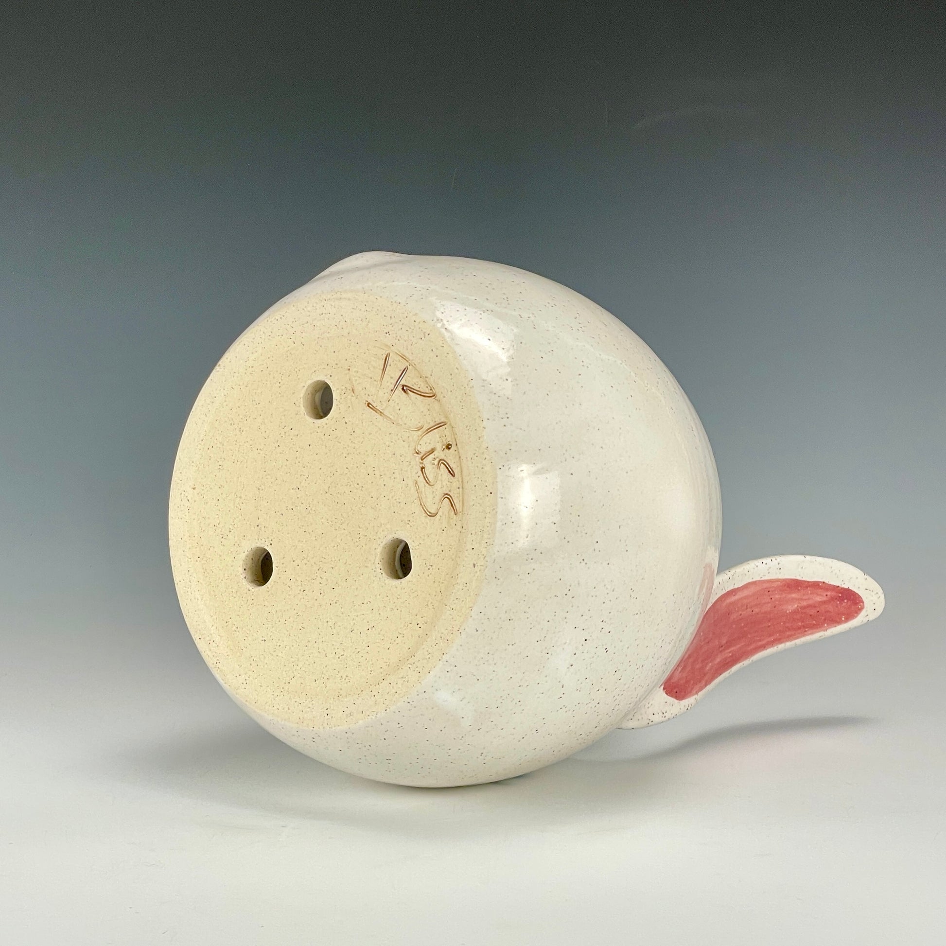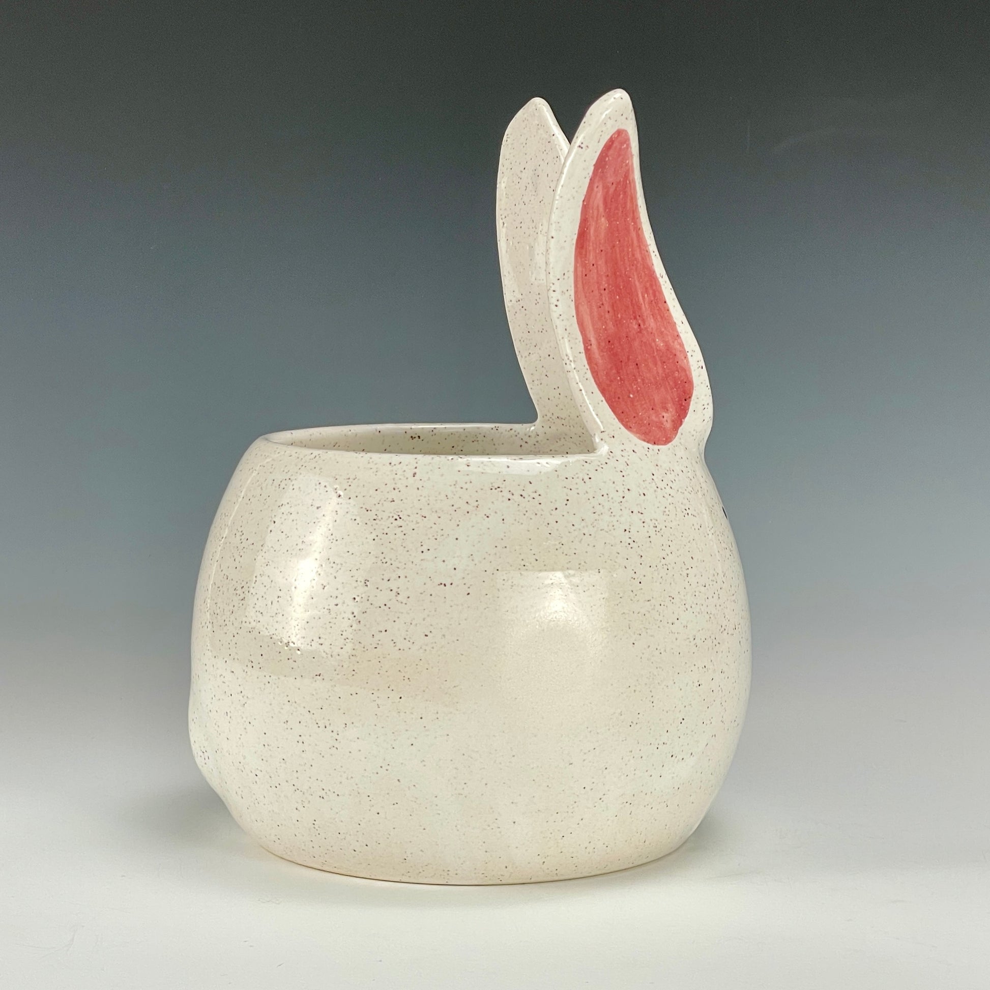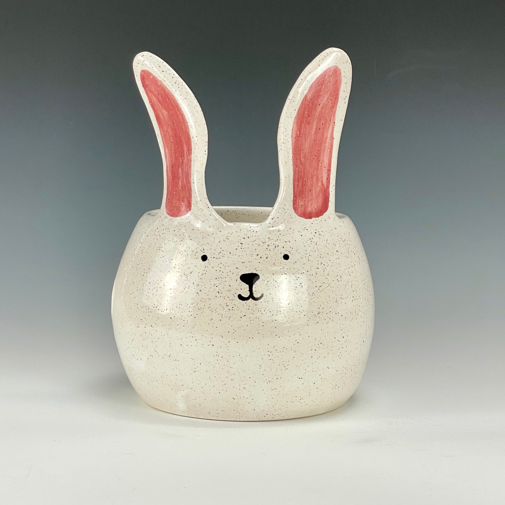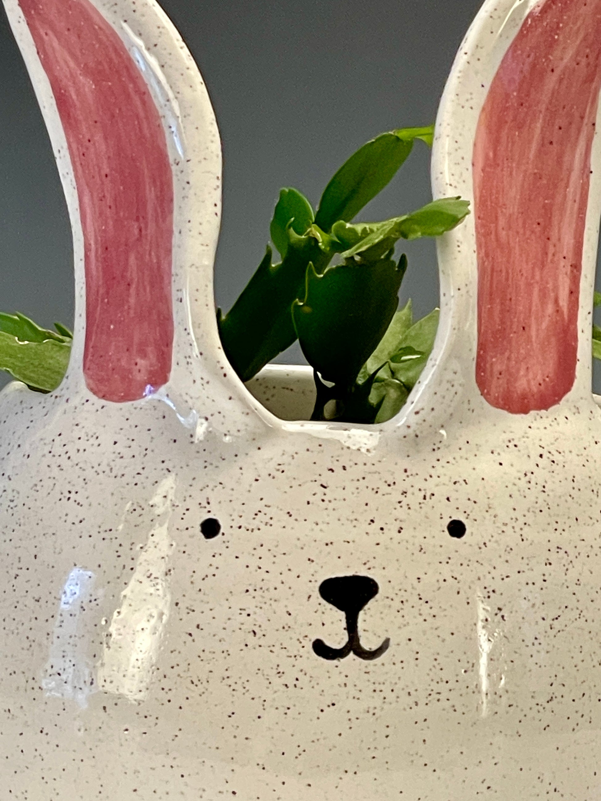 Happy Bunny Planter: This planter was thrown on the wheel using speckled clay. Once dry enough, it was trimmed, ears and drain holes were added. After it was bone dry, it was bisque fired, then glazed with hand-painted details, and fired again to this finished product.