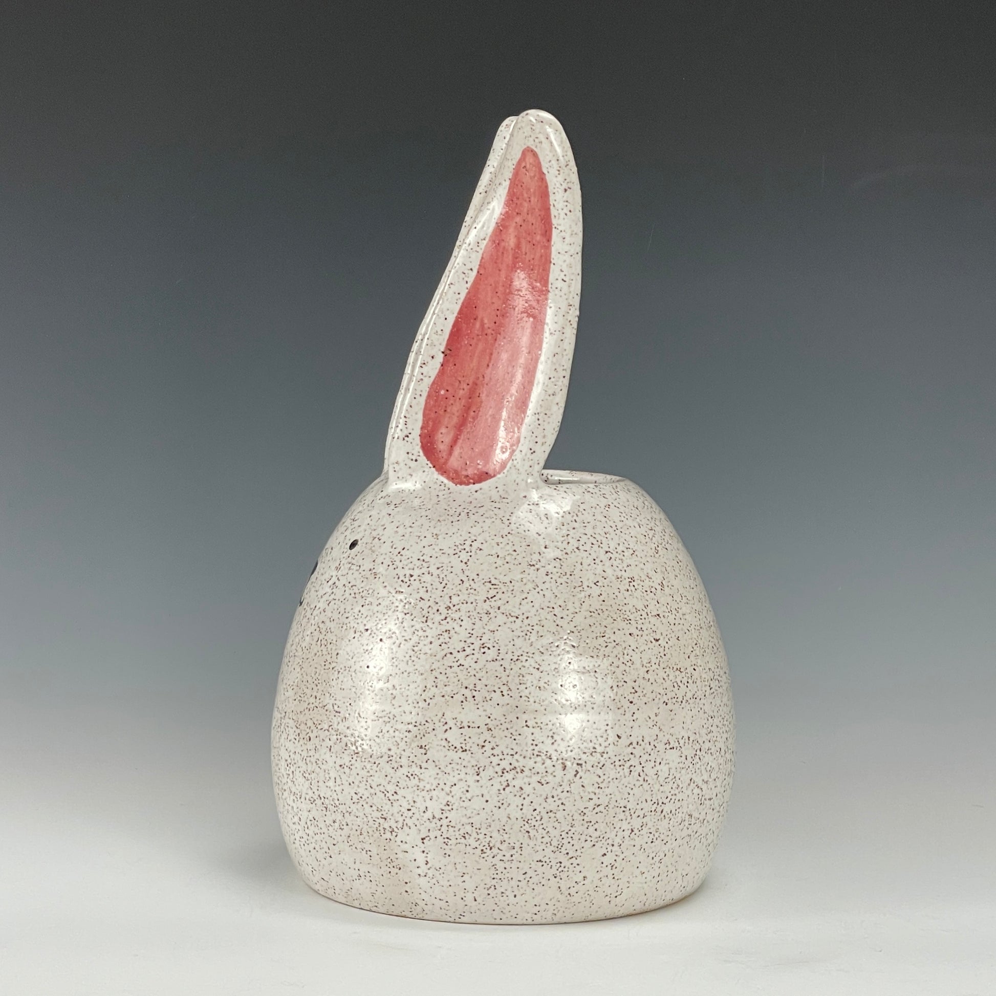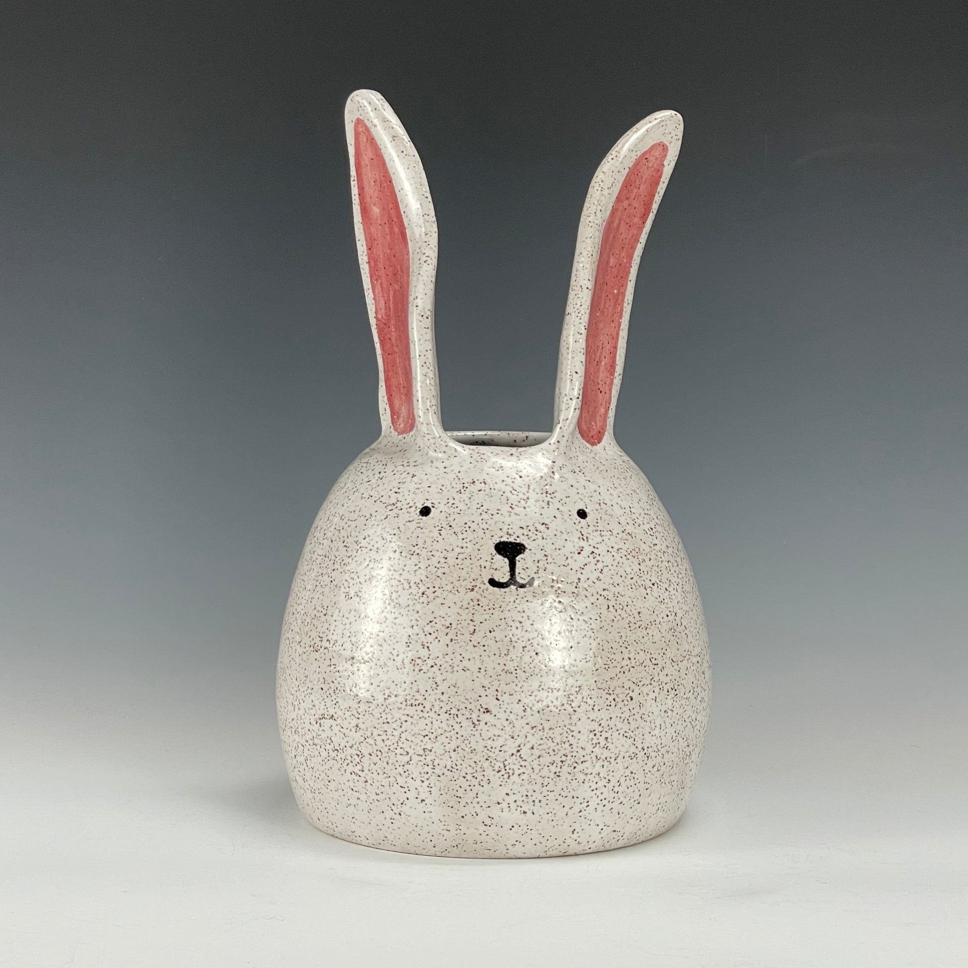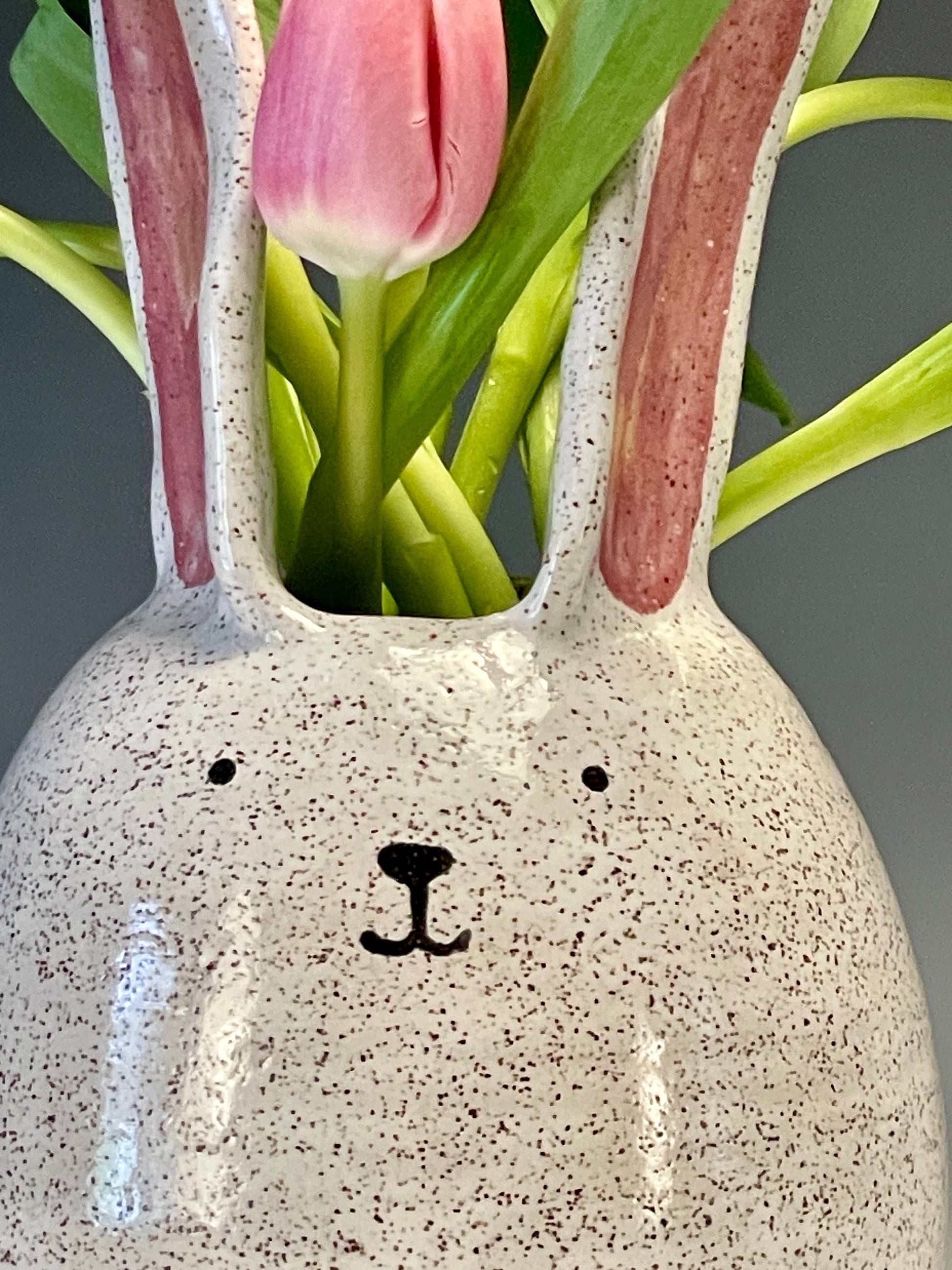 Happy Bunny Vase: This vase was thrown on the wheel using speckled clay. Once dry enough, it was trimmed, and ears were added. After it was bone dry, it was bisque fired, then glazed with hand-painted details, and fired again to this finished product.