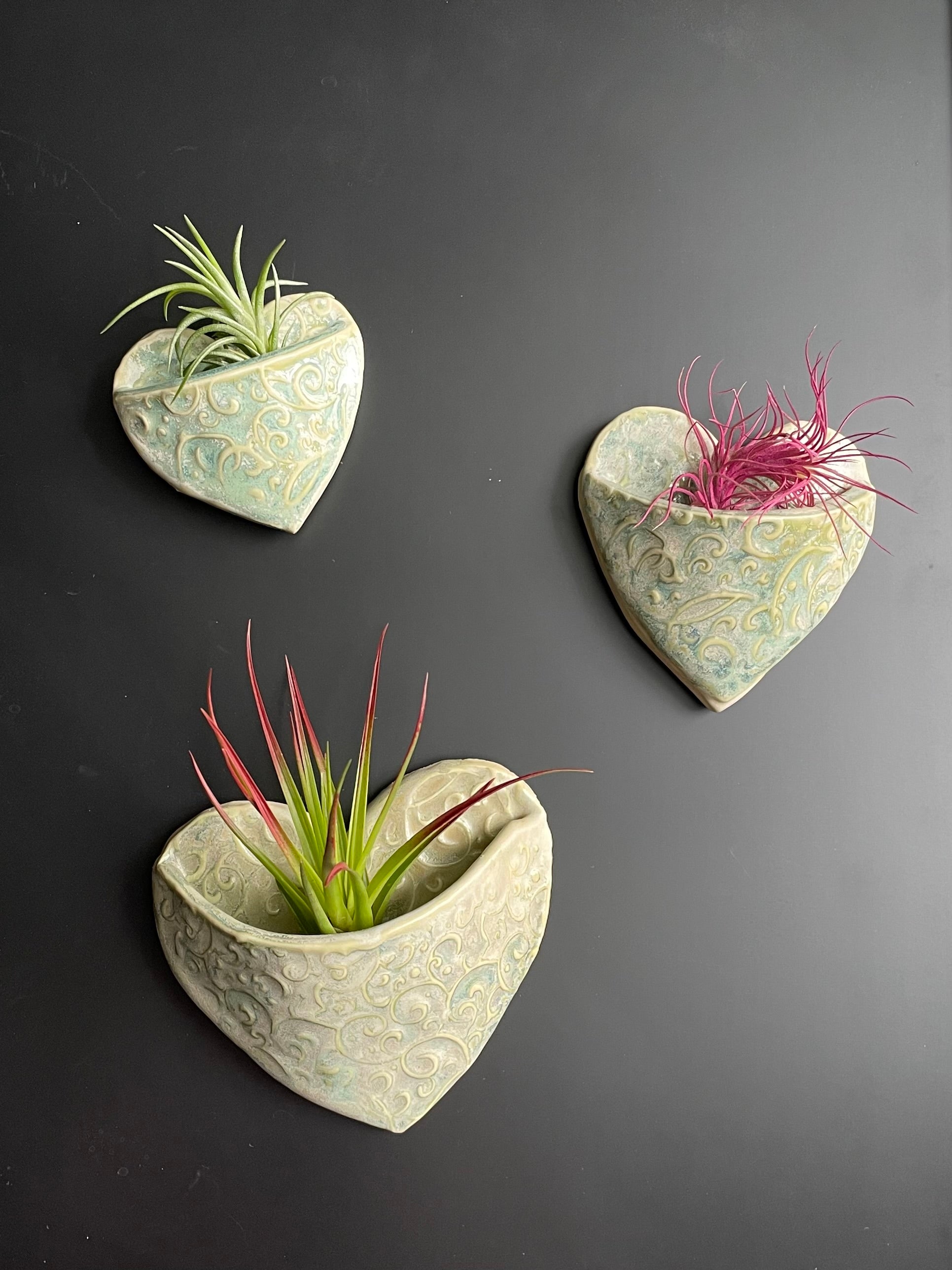 These heart magnets are hand-built. The 2 pieces are cut from a slab, then joined together to form a pocket. The pocket can hold an air plant, jewelry, or any other trinket you can think of.