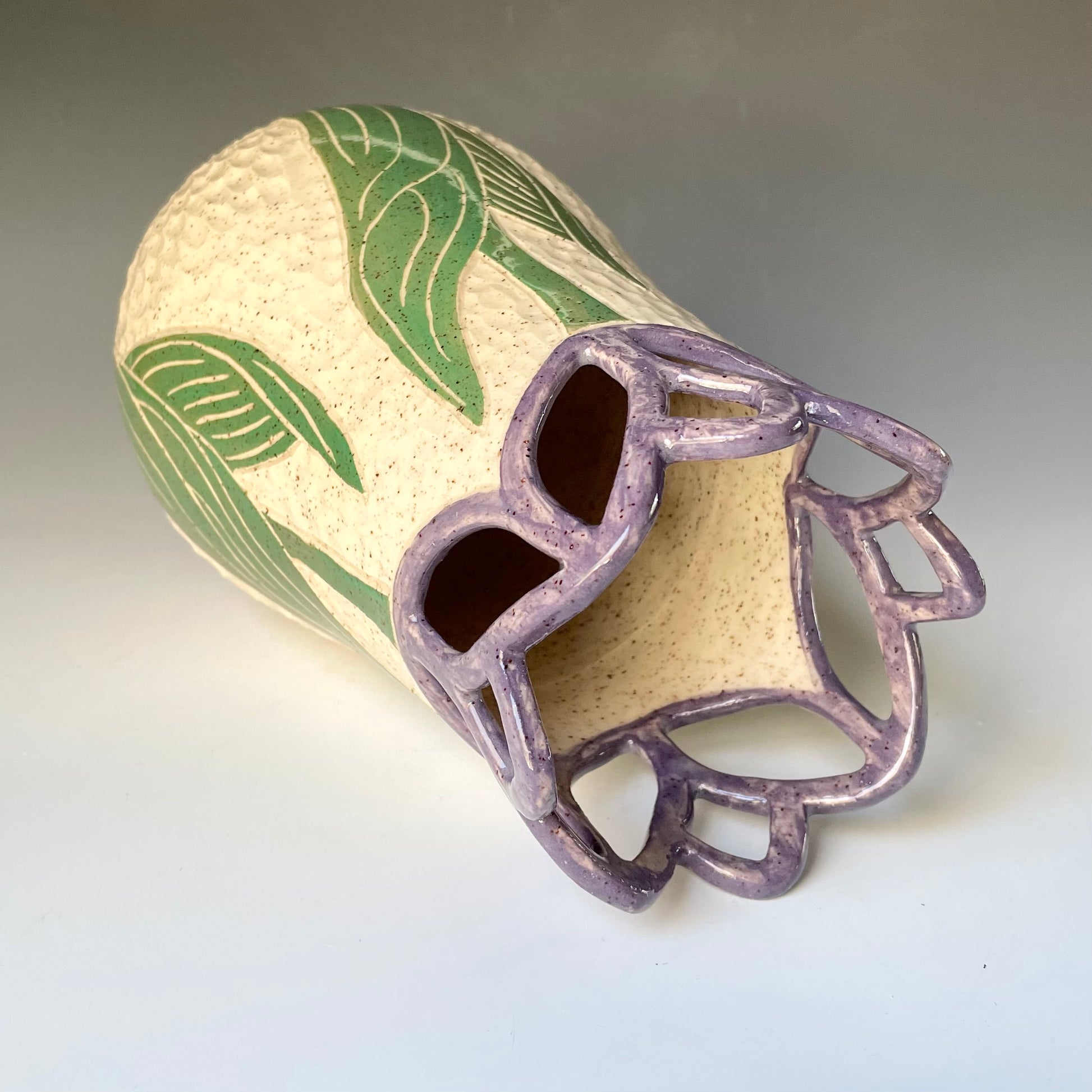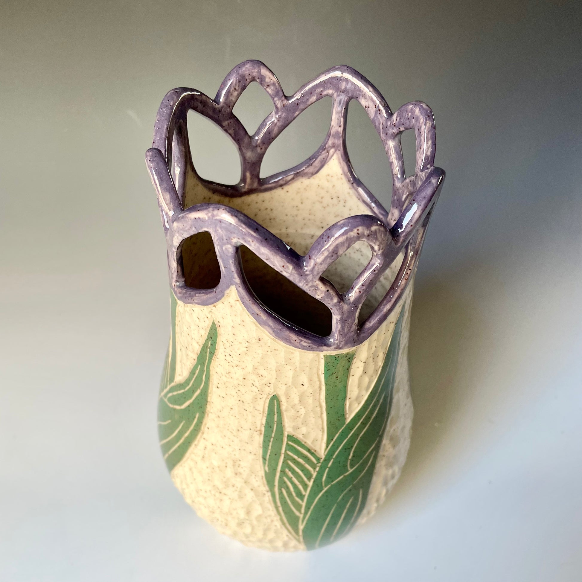 This vase was thrown on the wheel using speckled clay. It was trimmed once leather hard and then carefully pierced and smoothed. The leaves and stems were painted with underglaze and the pattern was carved with a technique called sgraffito. The clay around the leaves and flowers was carved to add texture and to make the flower stand out. It was bisque fired, then glazed clear and then fired to this finished product.