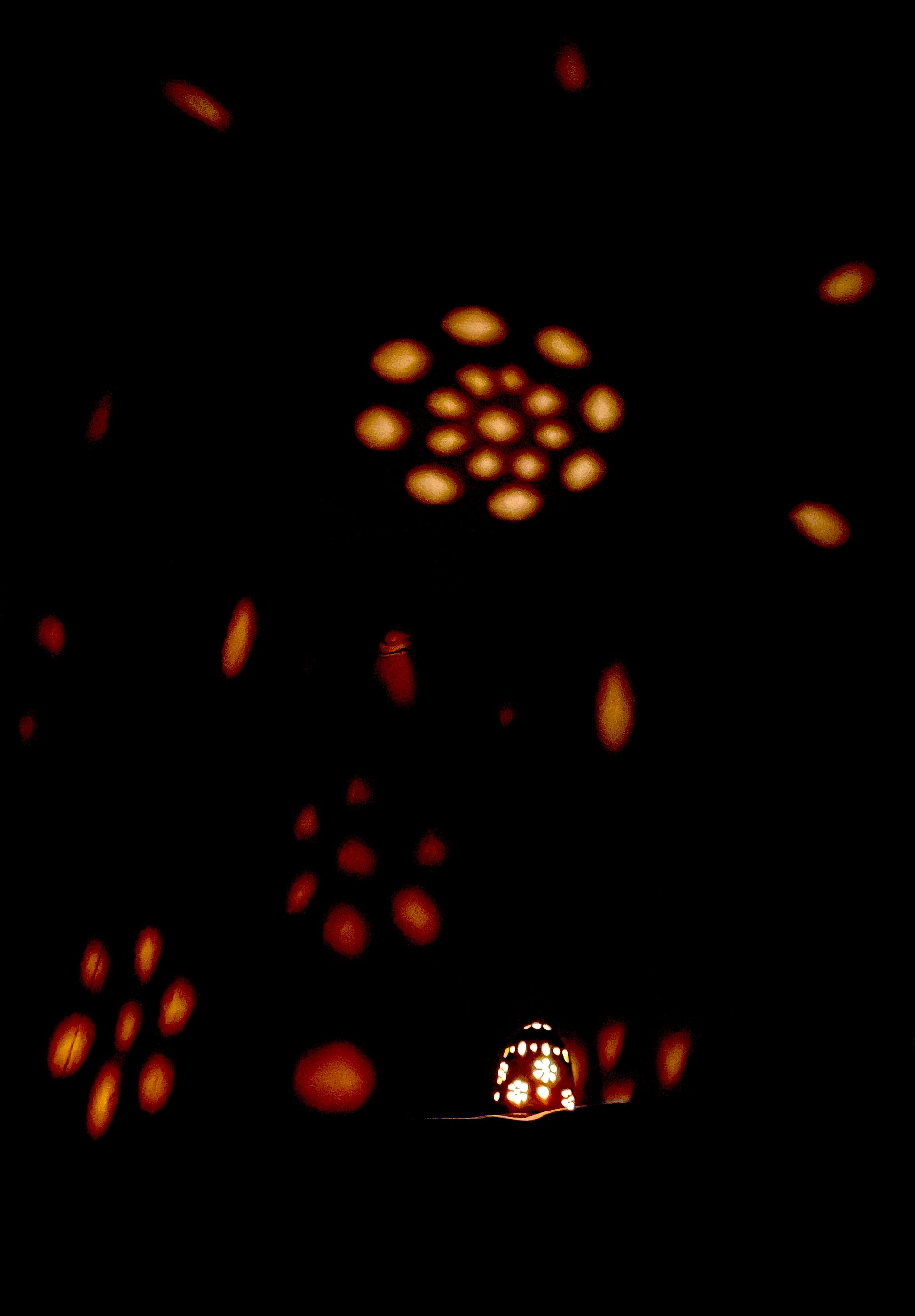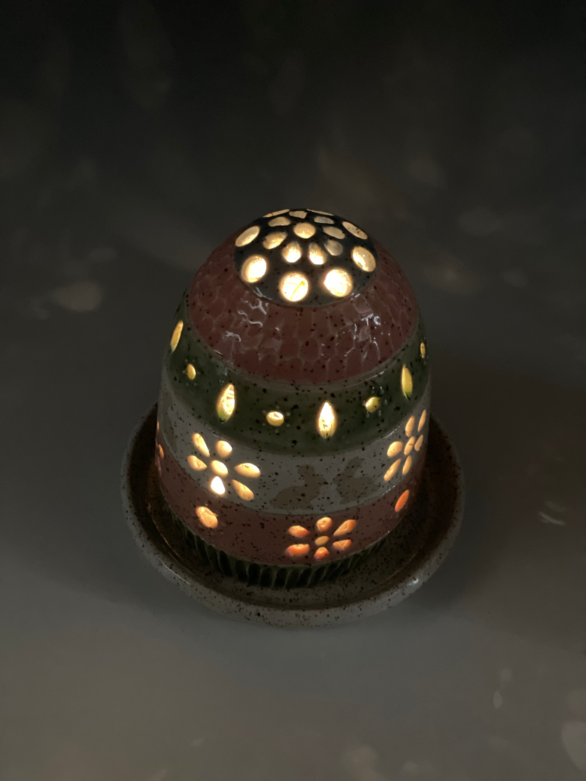 This luminary was thrown on the wheel using speckled clay. Once dry enough, it was trimmed, pierced, carved and slip was added for the dots. After it was bone dry, it was bisque fired, then glazed, and fired again to this finished product. The plate to hold the candle was also thrown on the wheel, trimmed, fired, glazed and then fired again for the final result.