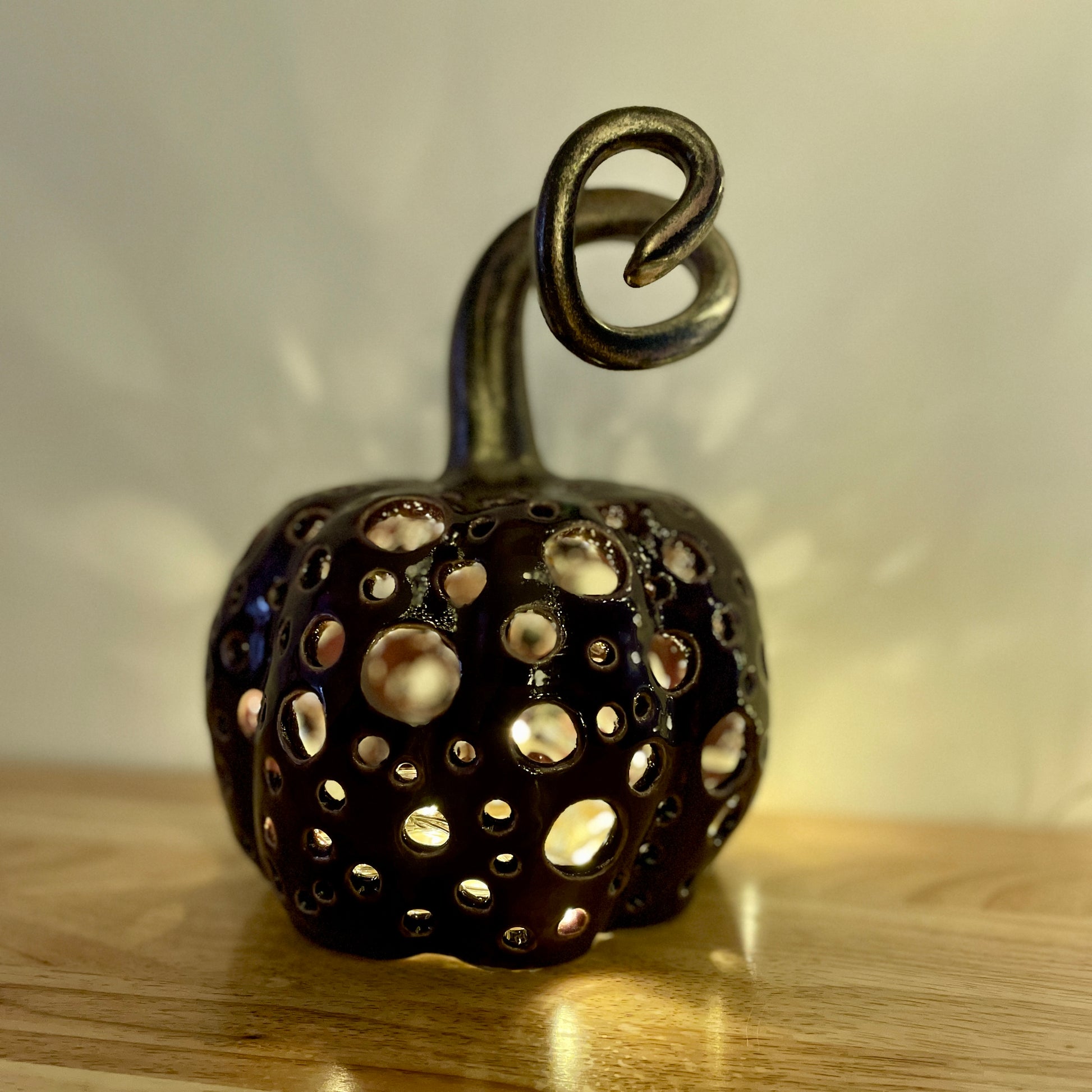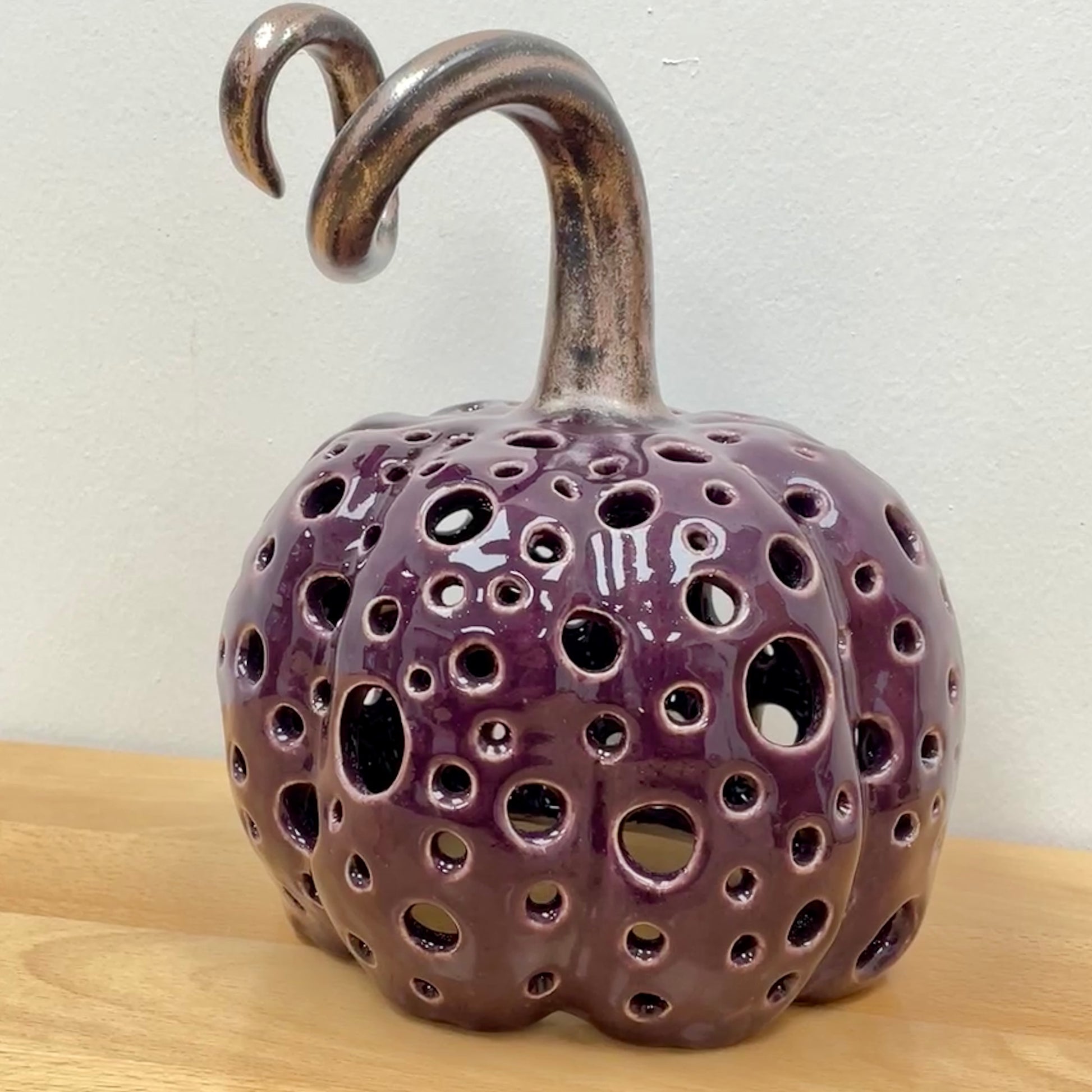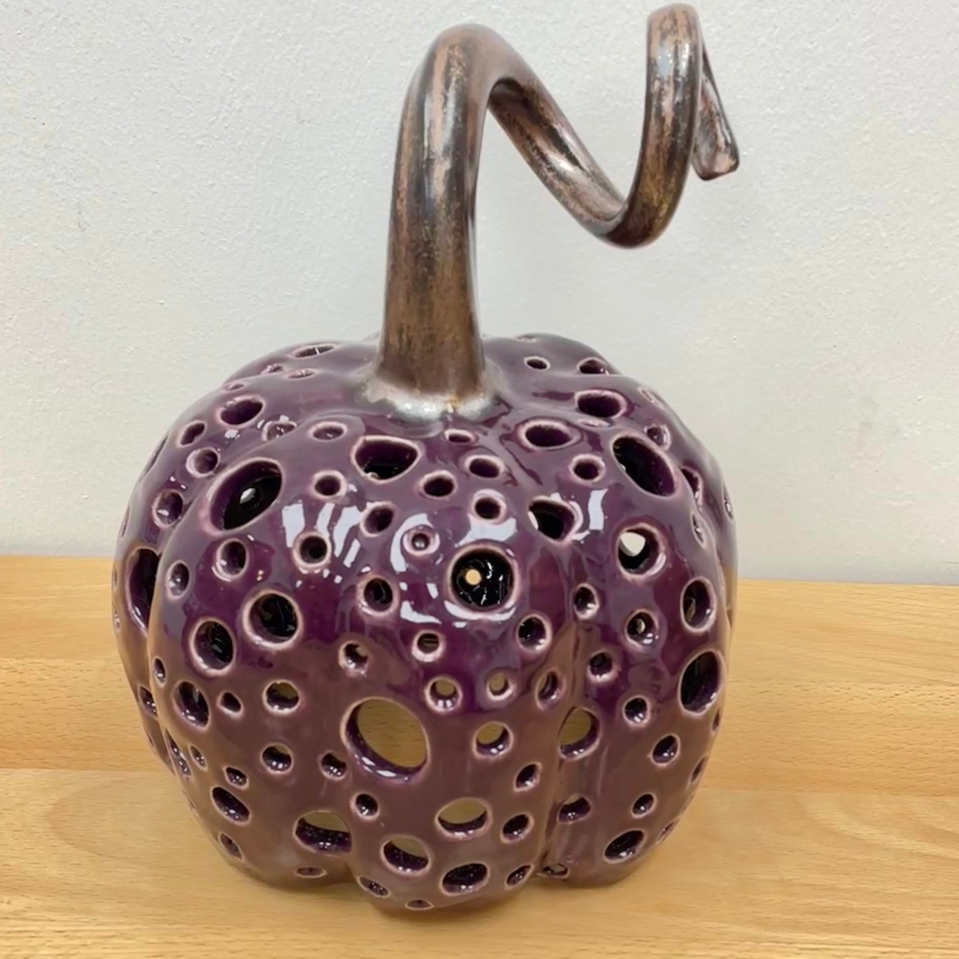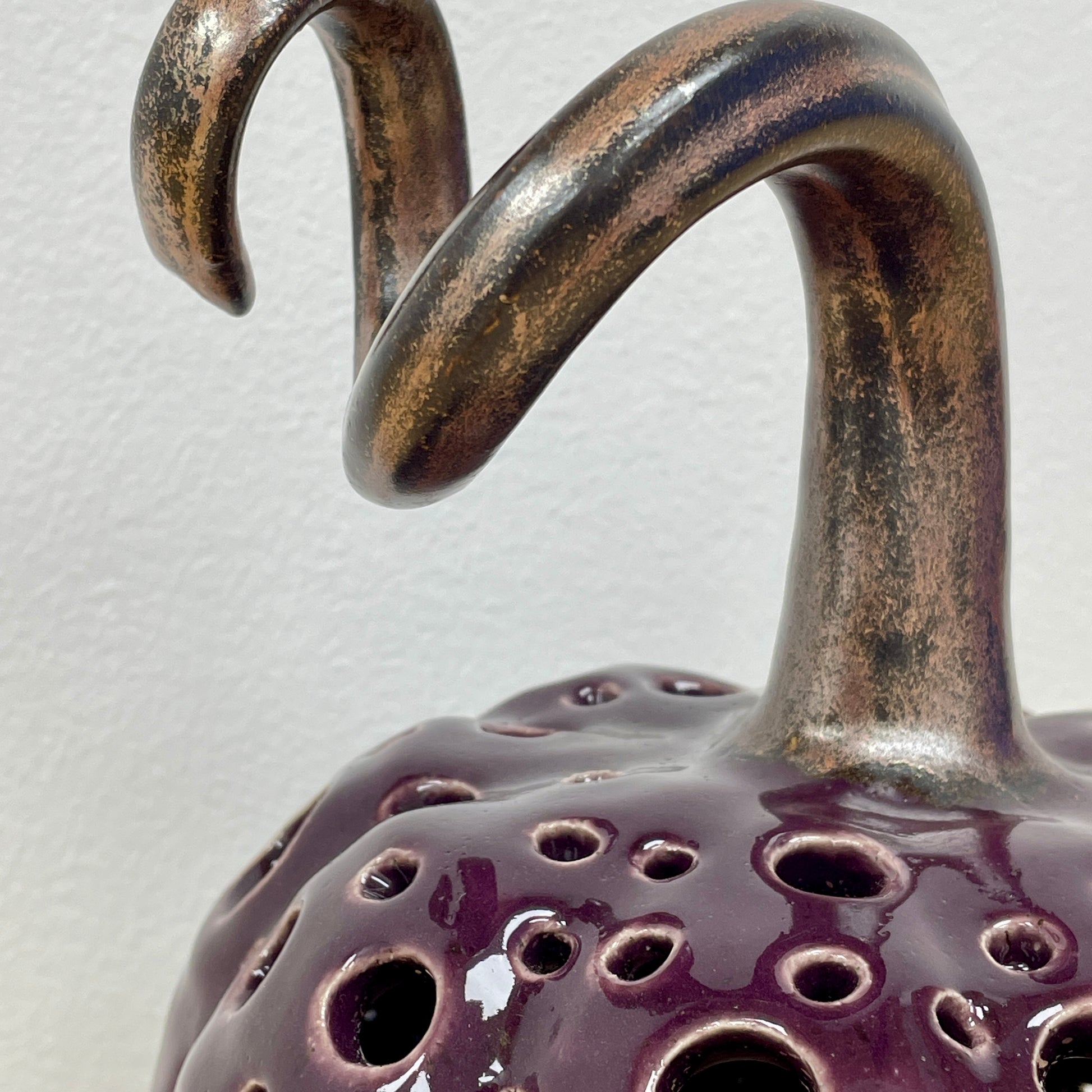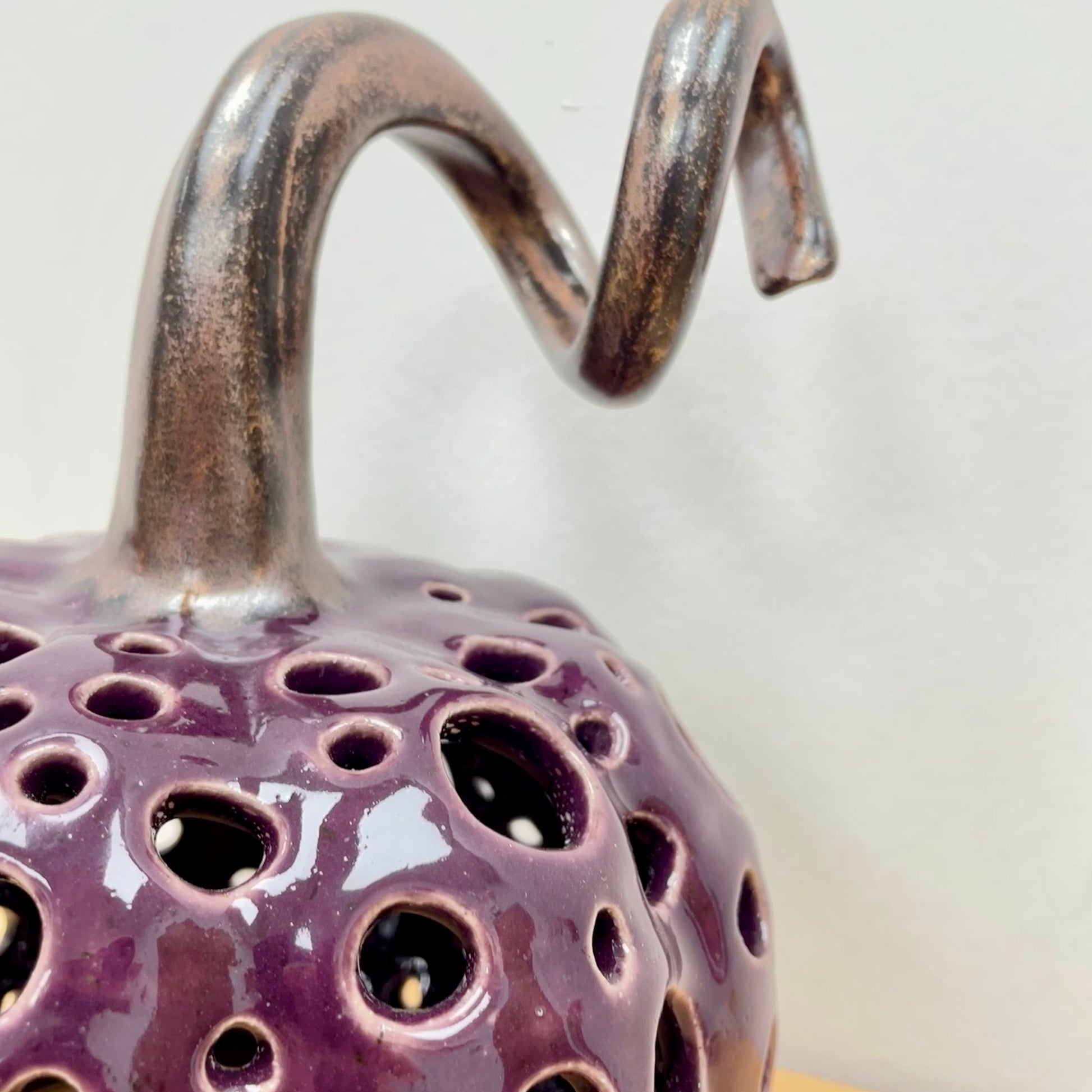 Made of speckled stoneware clay and glazed purple and copper stem.