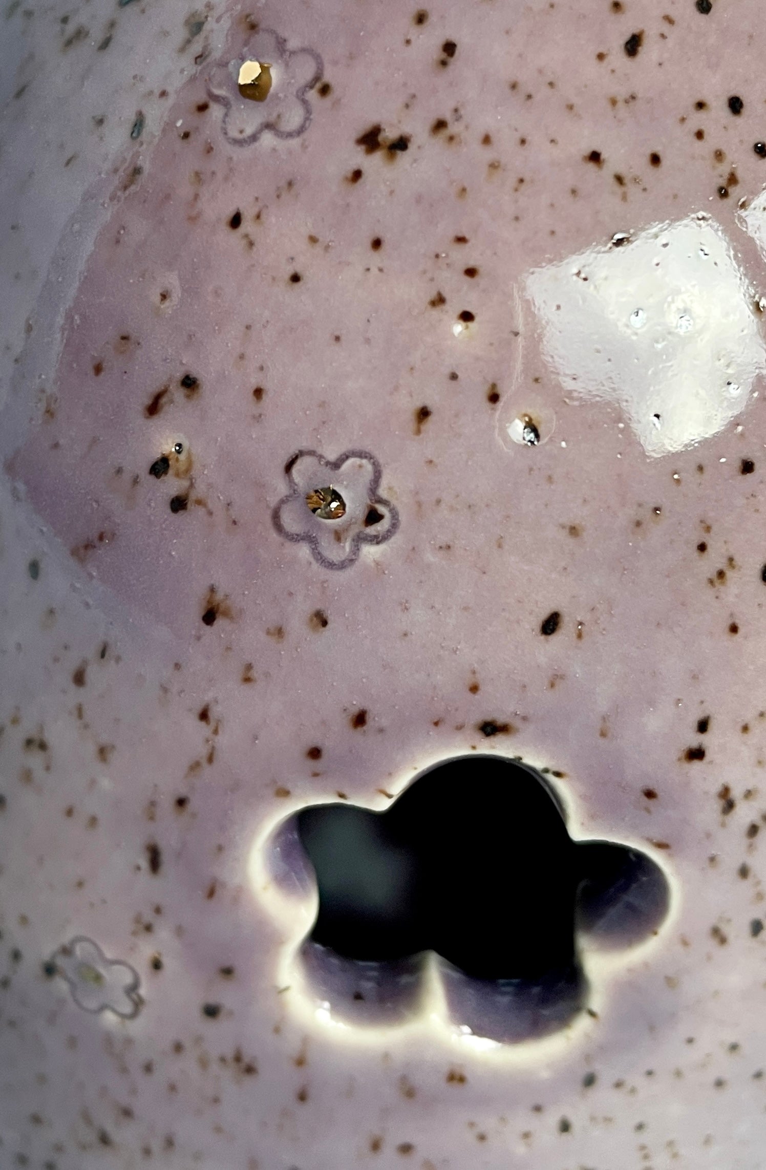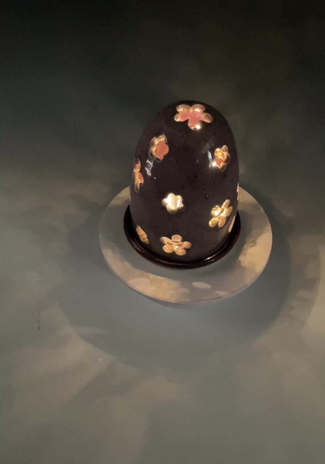 This luminary was thrown on the wheel using speckled buff clay. Once dry enough, it was trimmed, pierced, carved and slip was added for the dots. After it was bone dry, it was bisque fired, then glazed, and fired again to this finished product. The plate to hold the candle was also thrown on the wheel, trimmed, fired, glazed and then fired again. Last touch, added gold luster on the small dots and fired one more time for the finished product.