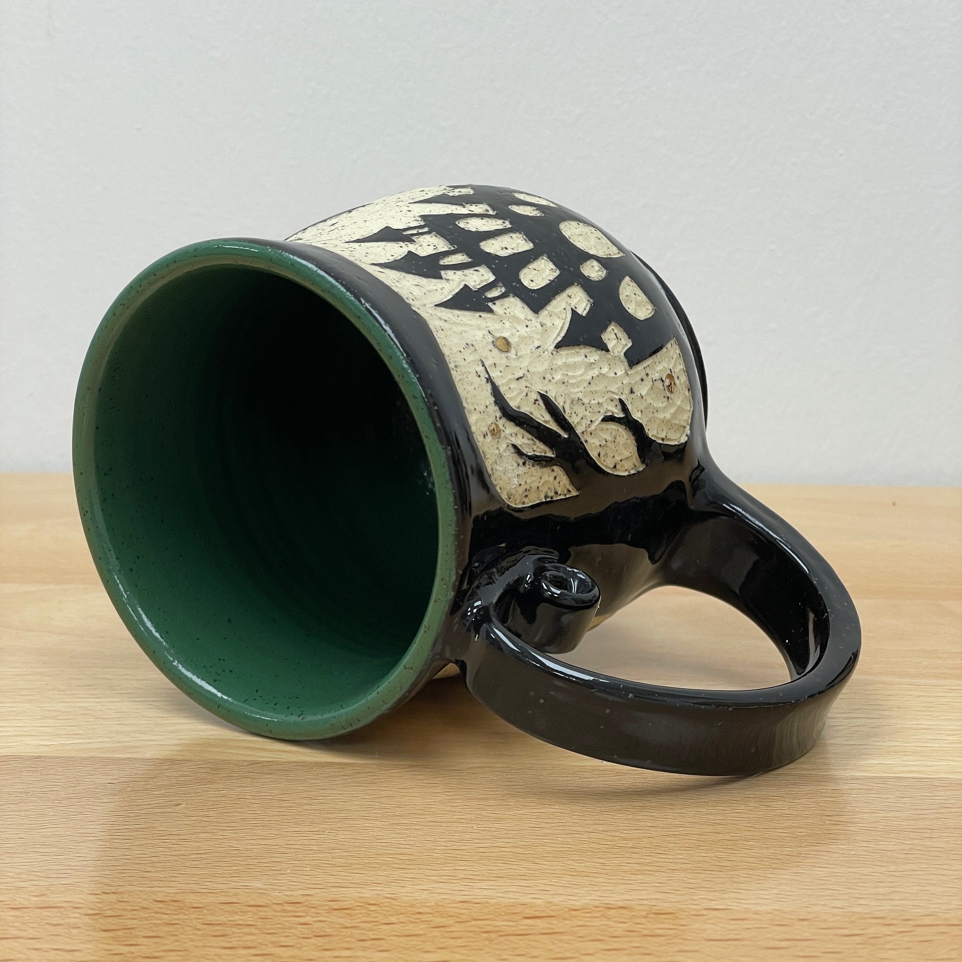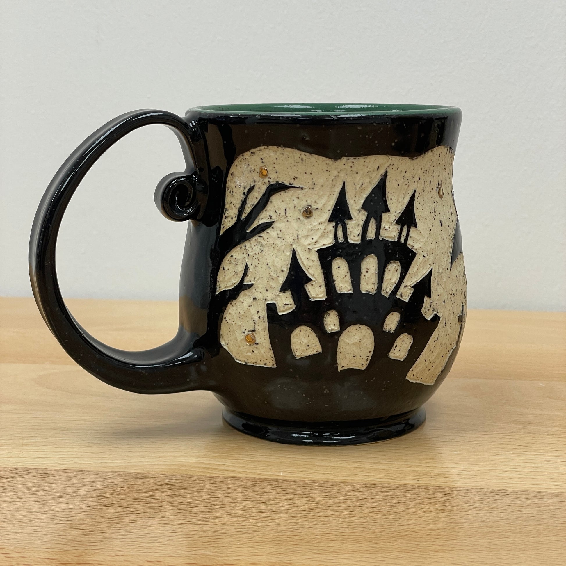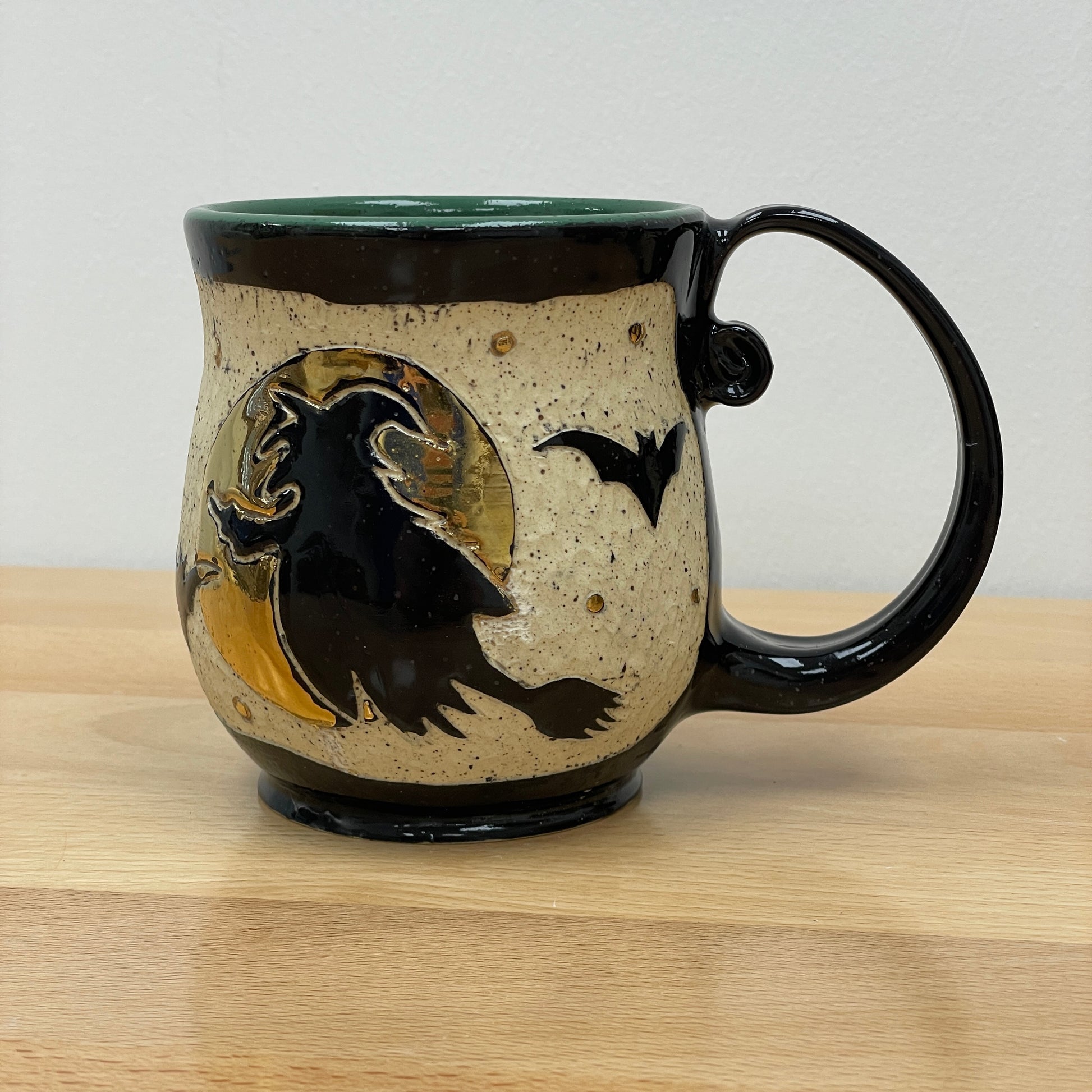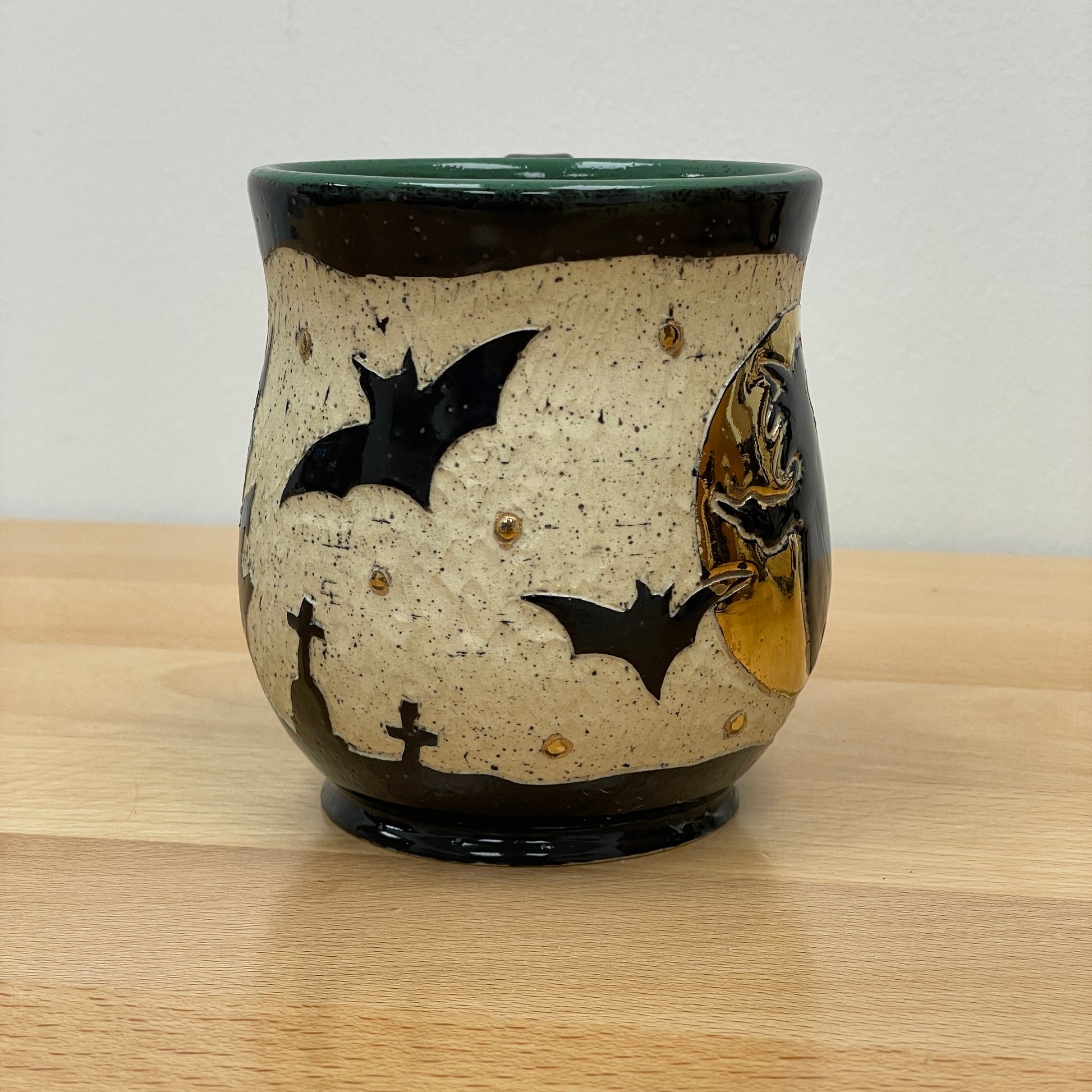 This mug was thrown on the wheel. Once dry enough, it was trimmed and the handle was formed and attached. Then black underglaze was added and carved away to make the halloween design. After it was bone dry, it was bisque fired, then glazed and fired. Then gold luster was added and the mug was fired one last time to this finished product.