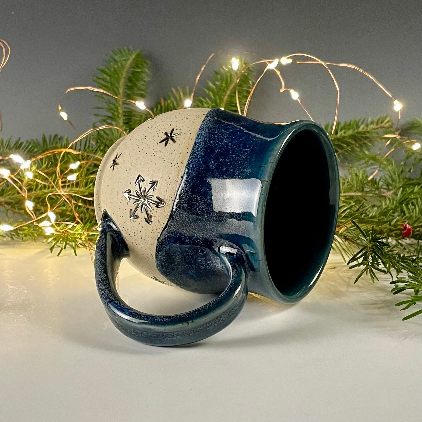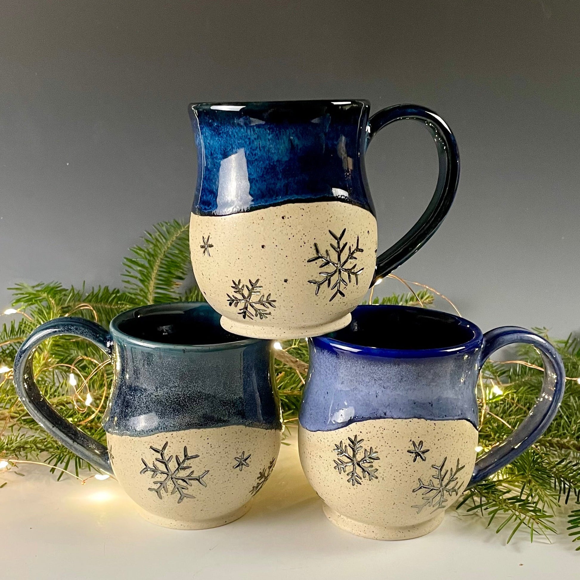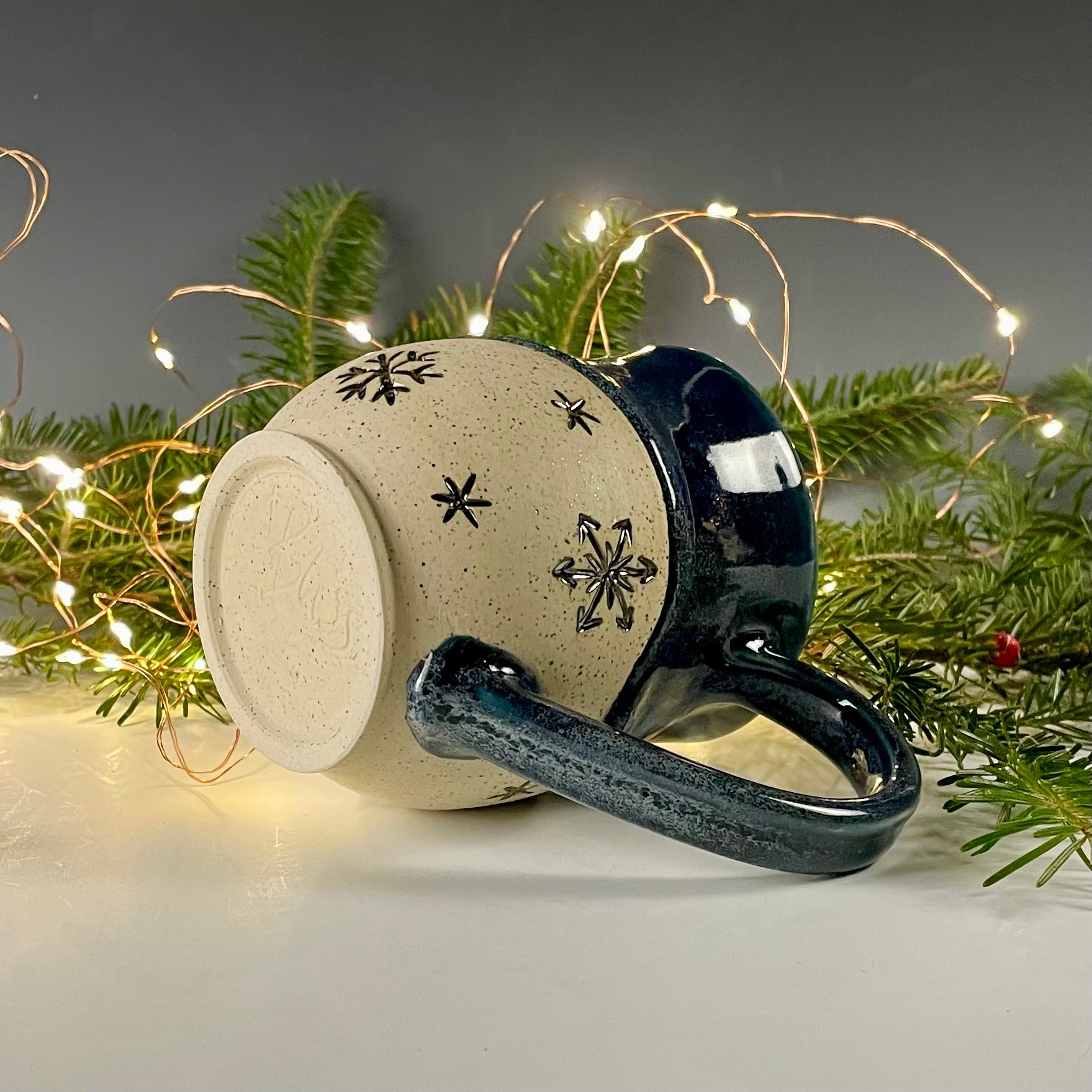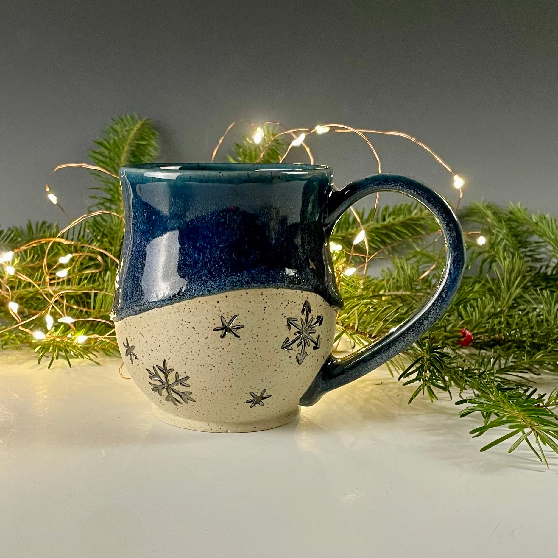 This mug was thrown on the wheel. Once dry enough, it was trimmed and the handle was formed and attached. Then the snowflakes were carved. After it was bone dry, it was bisque fired, then glazed and fired one last time to this finished product.