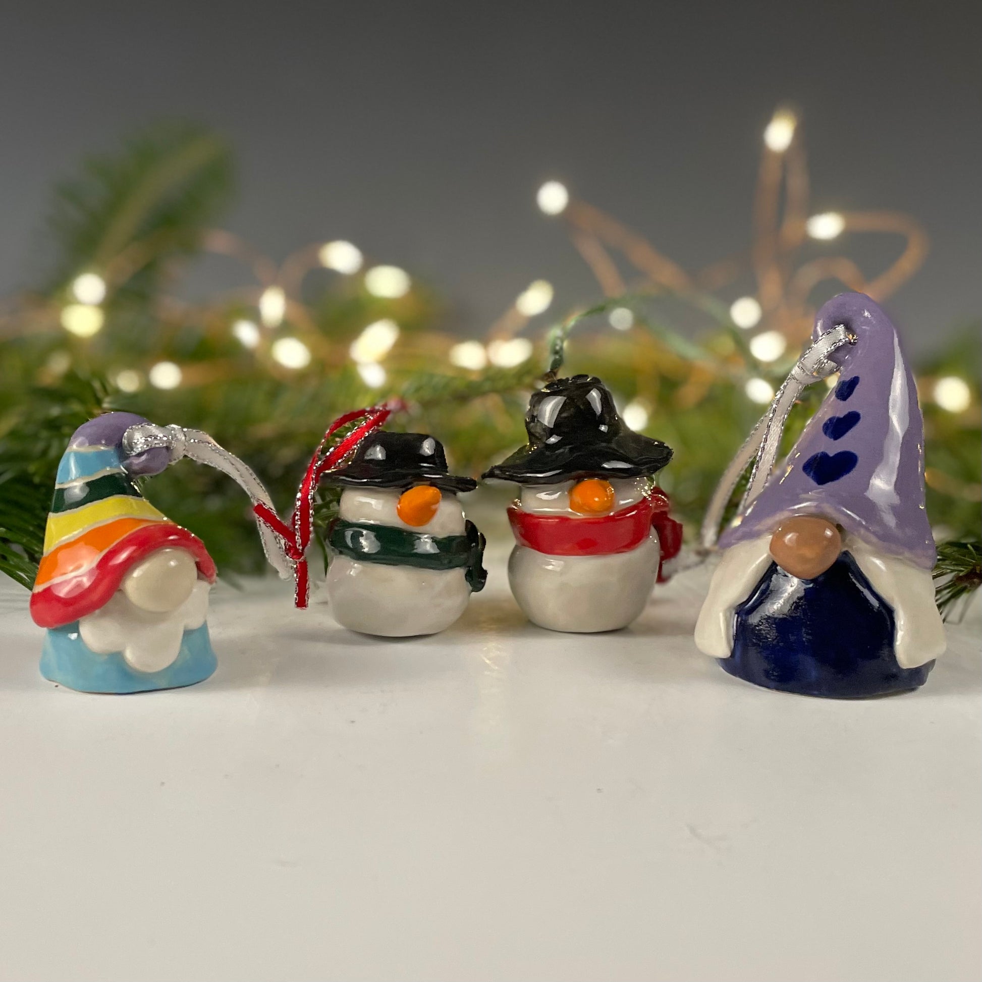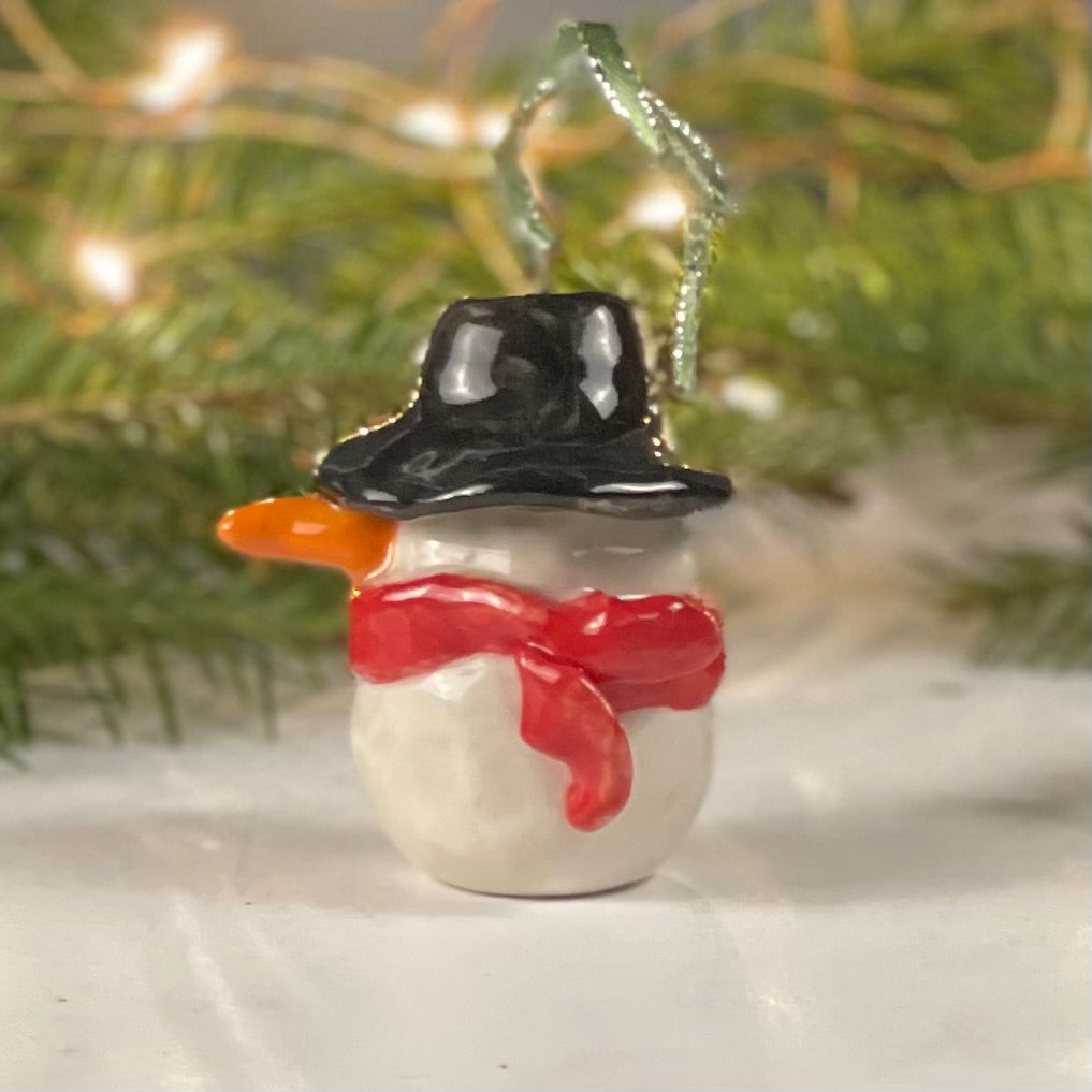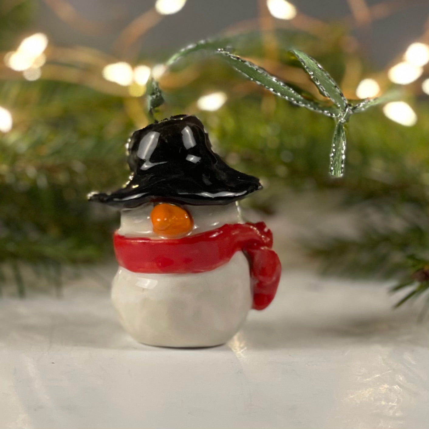 Handbuilt Snowman Ornament with red scarf and black hat.