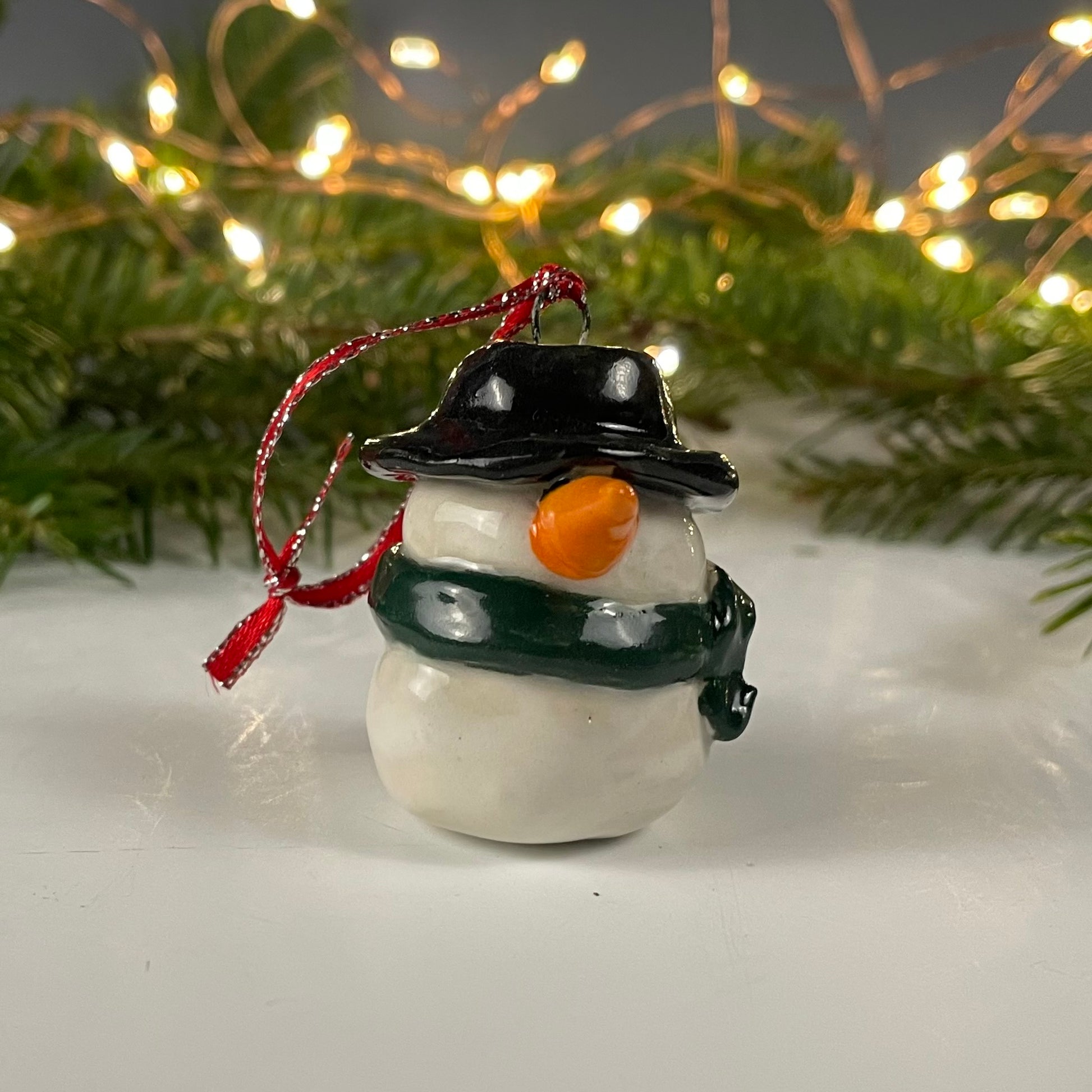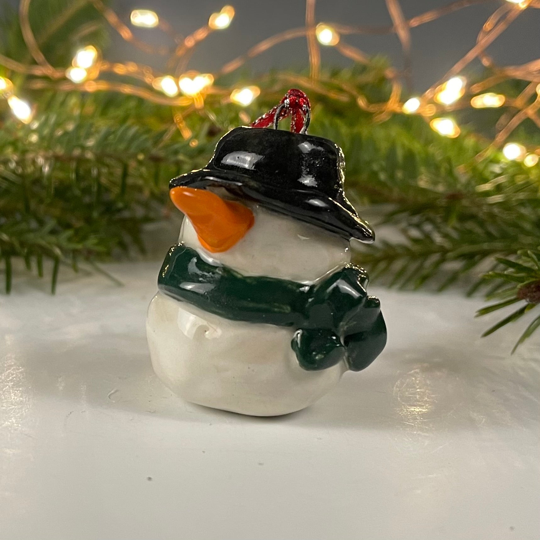 Handbuilt Snowman Ornament with green scarf and black hat.