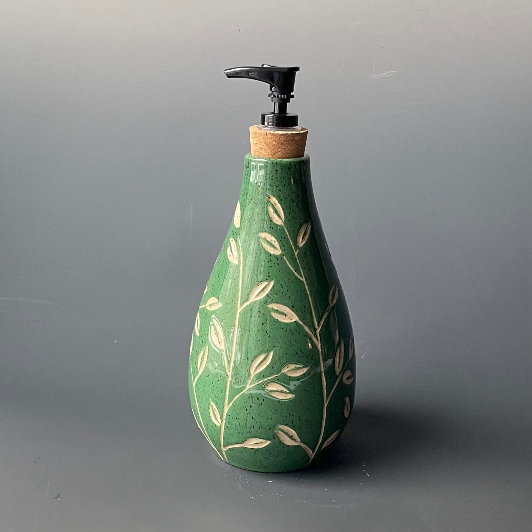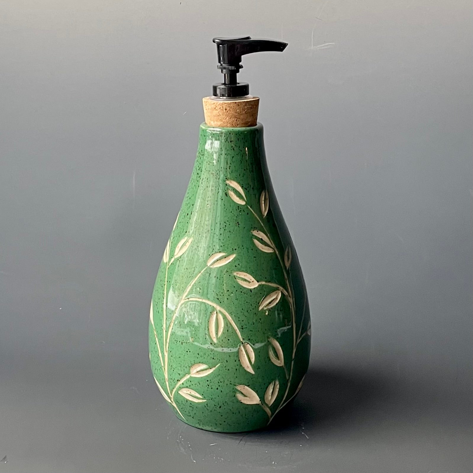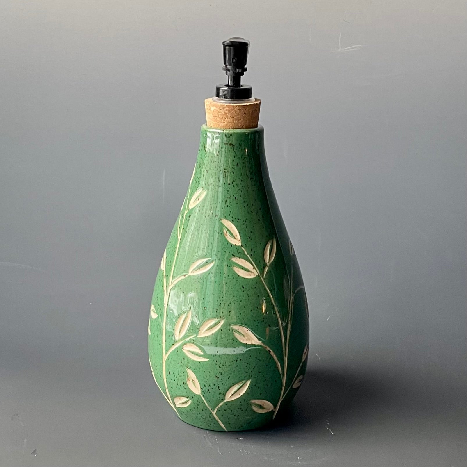 This dispenser was made on the potter's wheel out of speckled stoneware. Once it was leather hard, it was trimmed and then painted with green underglaze. The leaf pattern was carefully carved into the clay. It was fired once, glazed and then fired again for this finished product.