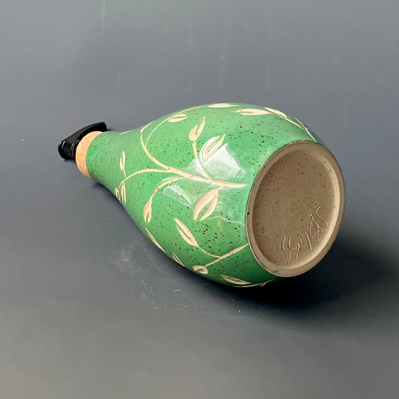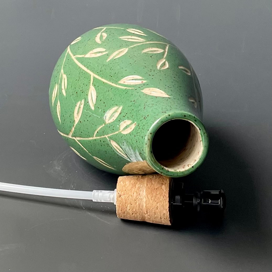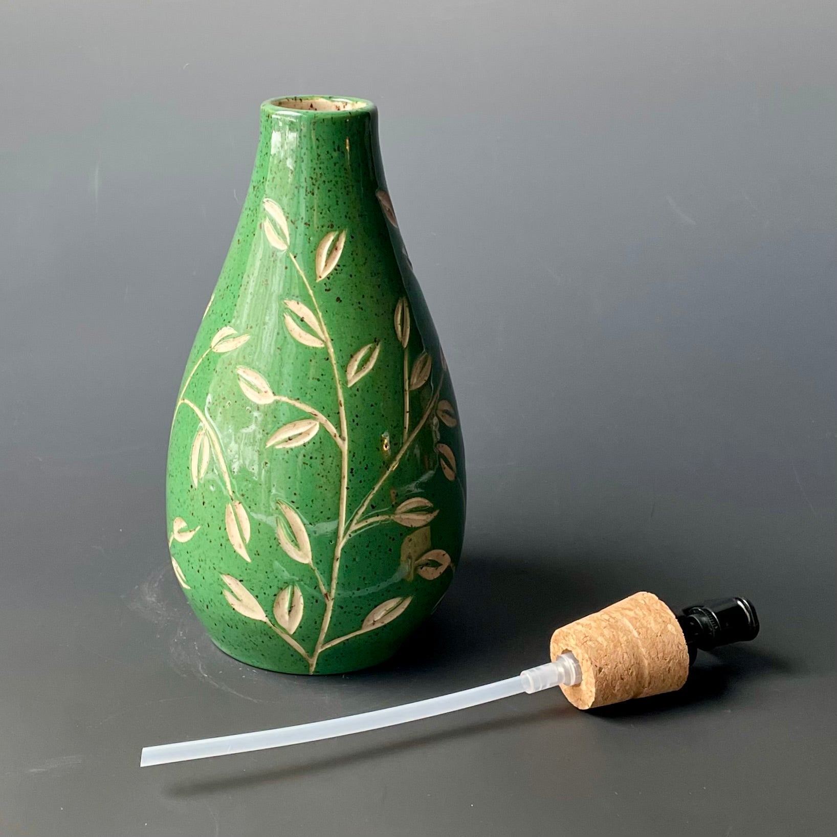 This dispenser was made on the potter's wheel out of speckled stoneware. Once it was leather hard, it was trimmed and then painted with green underglaze. The leaf pattern was carefully carved into the clay. It was fired once, glazed and then fired again for this finished product.