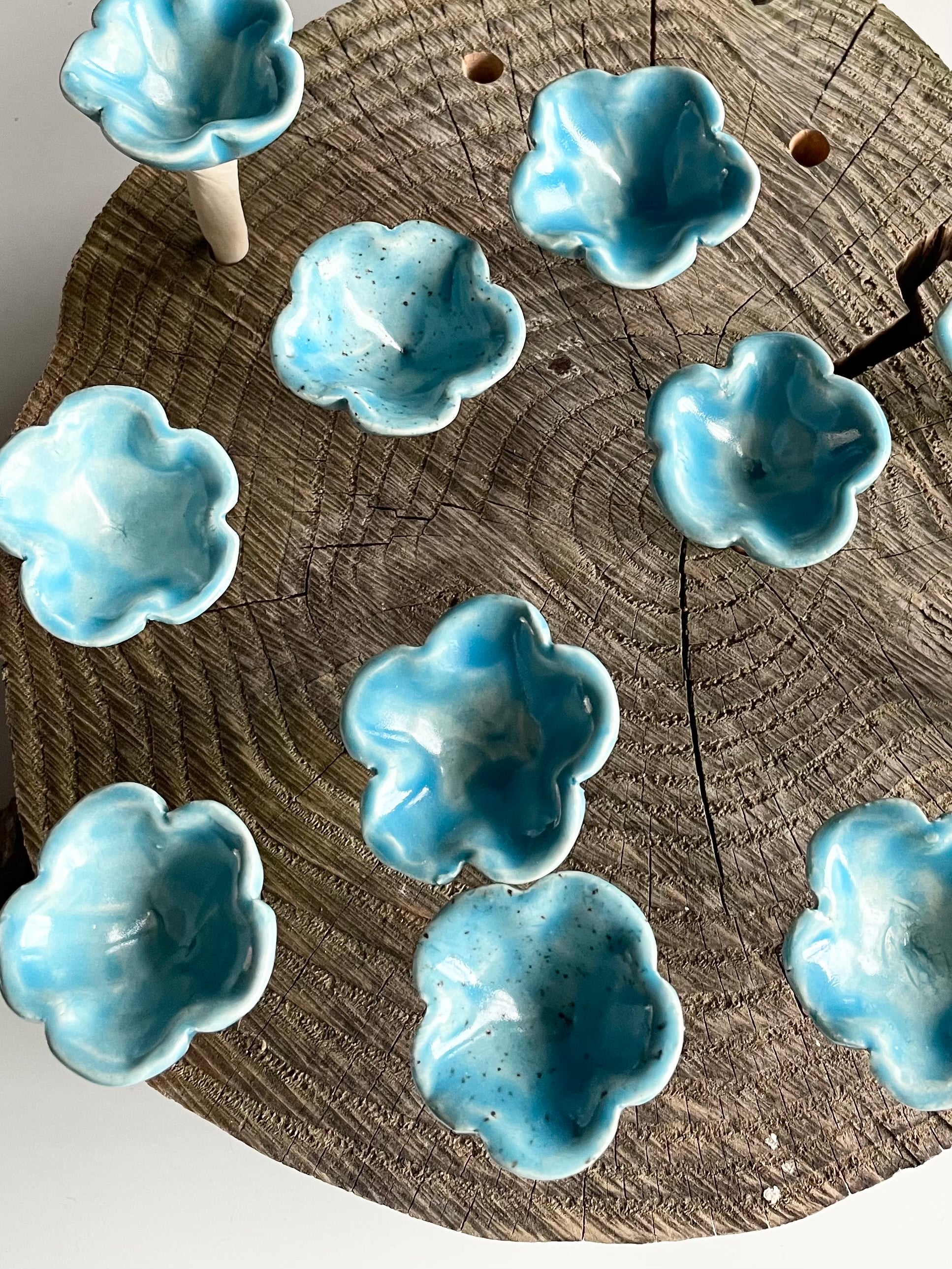 These small cups are handmade stoneware cups for your garden or outdoor plant. It collects a teaspoon of water for thirsty pollinators.