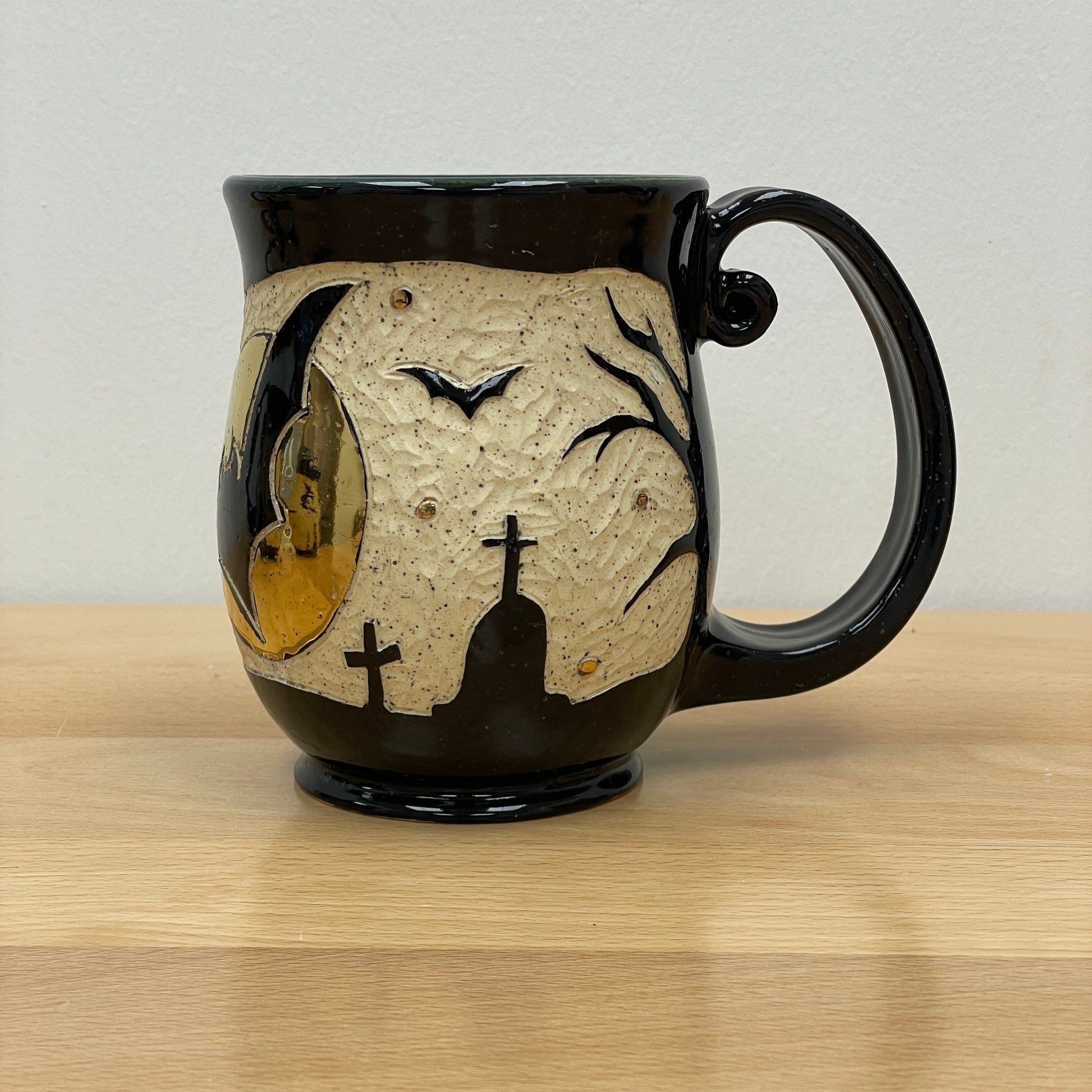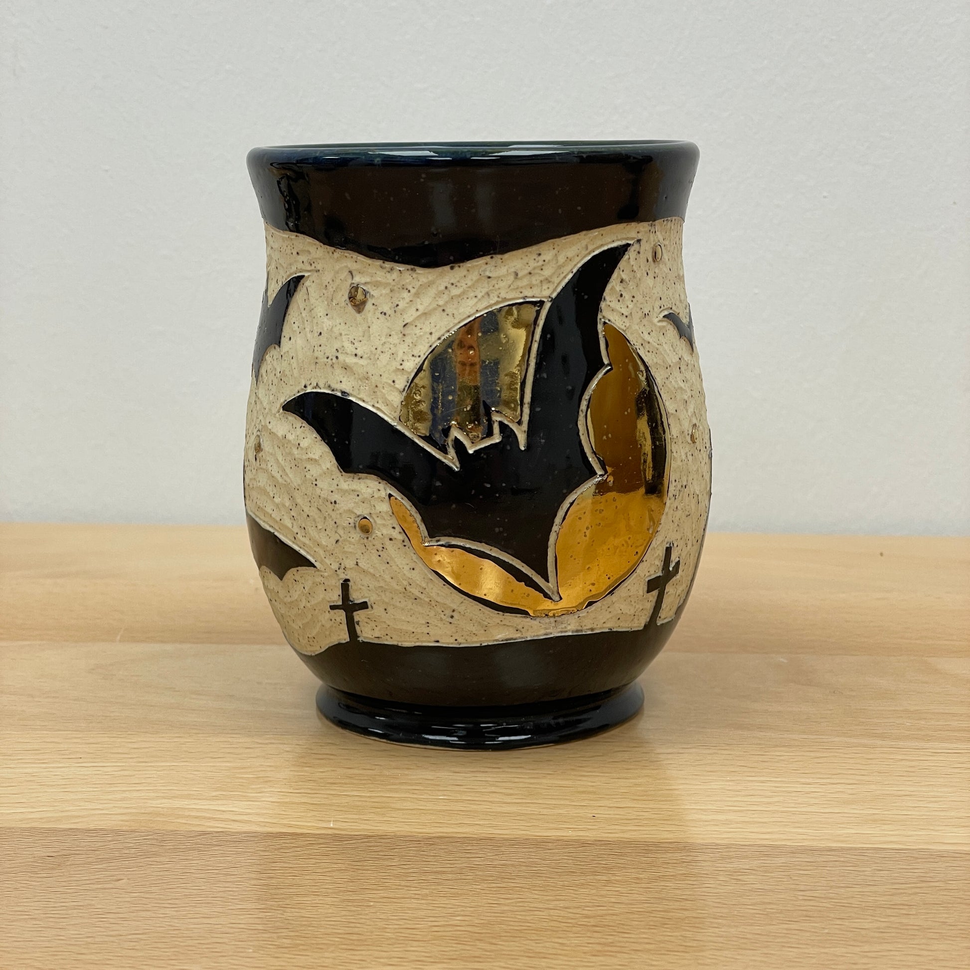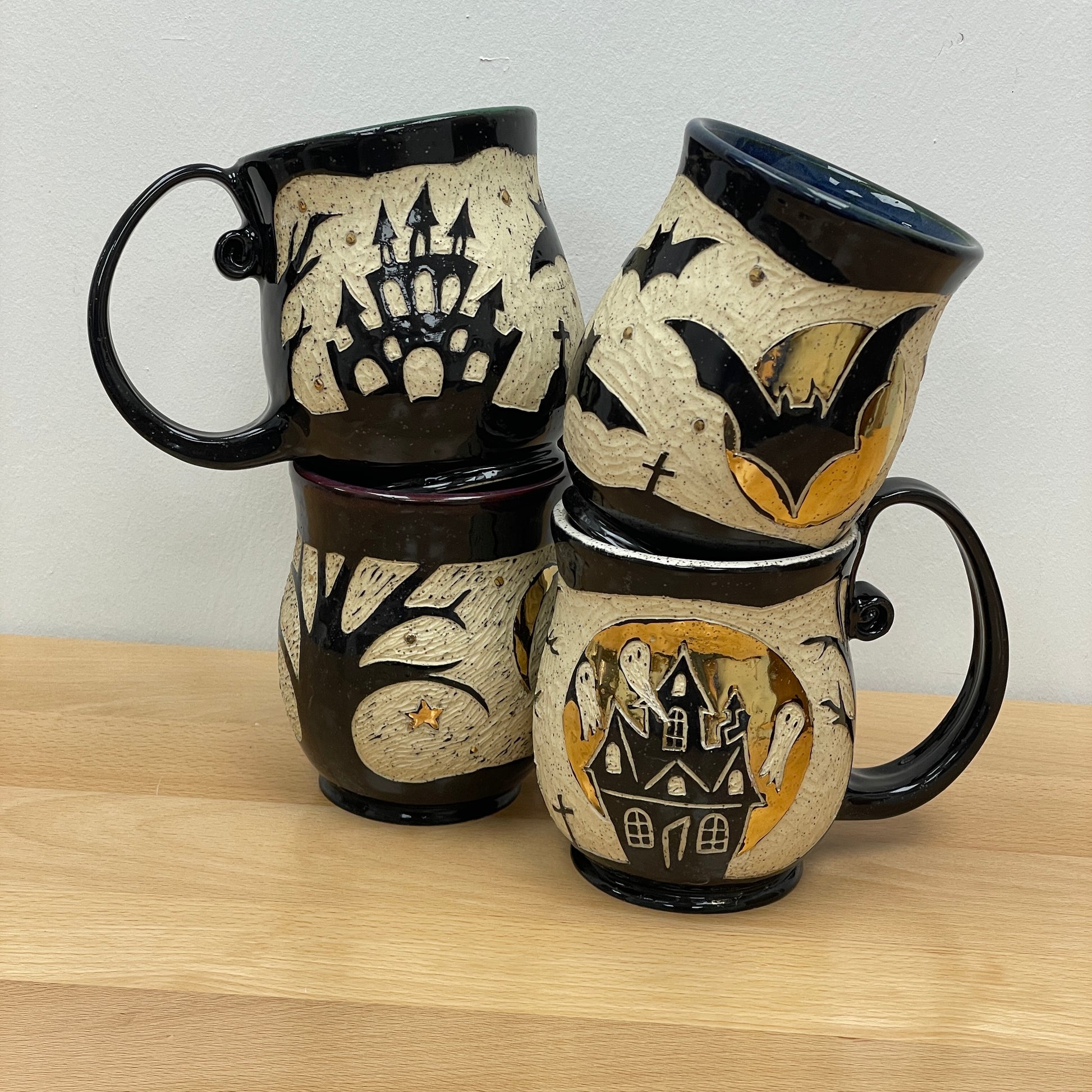 This mug was thrown on the wheel. Once dry enough, it was trimmed and the handle was formed and attached. Then black underglaze was added and carved away to make the halloween design. After it was bone dry, it was bisque fired, then glazed and fired. Then gold luster was added and the mug was fired one last time to this finished product.
