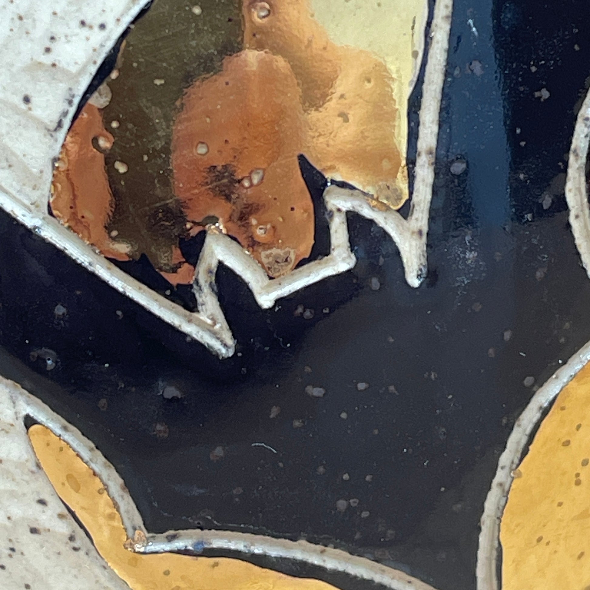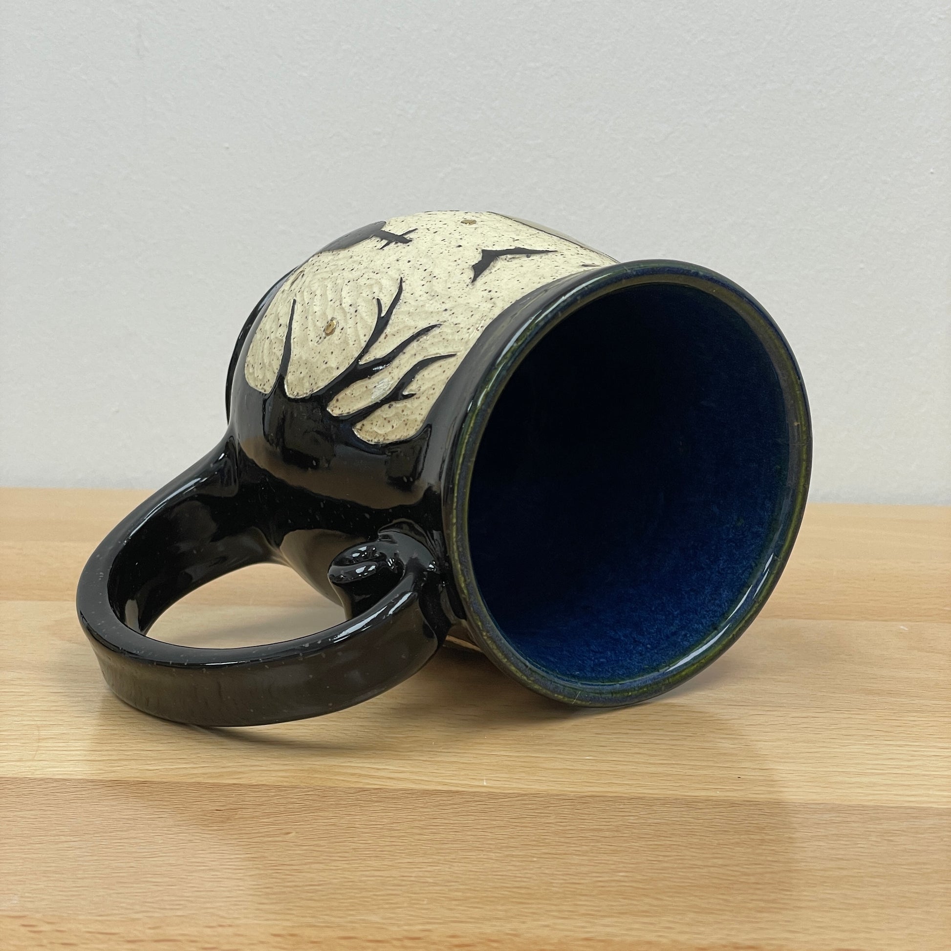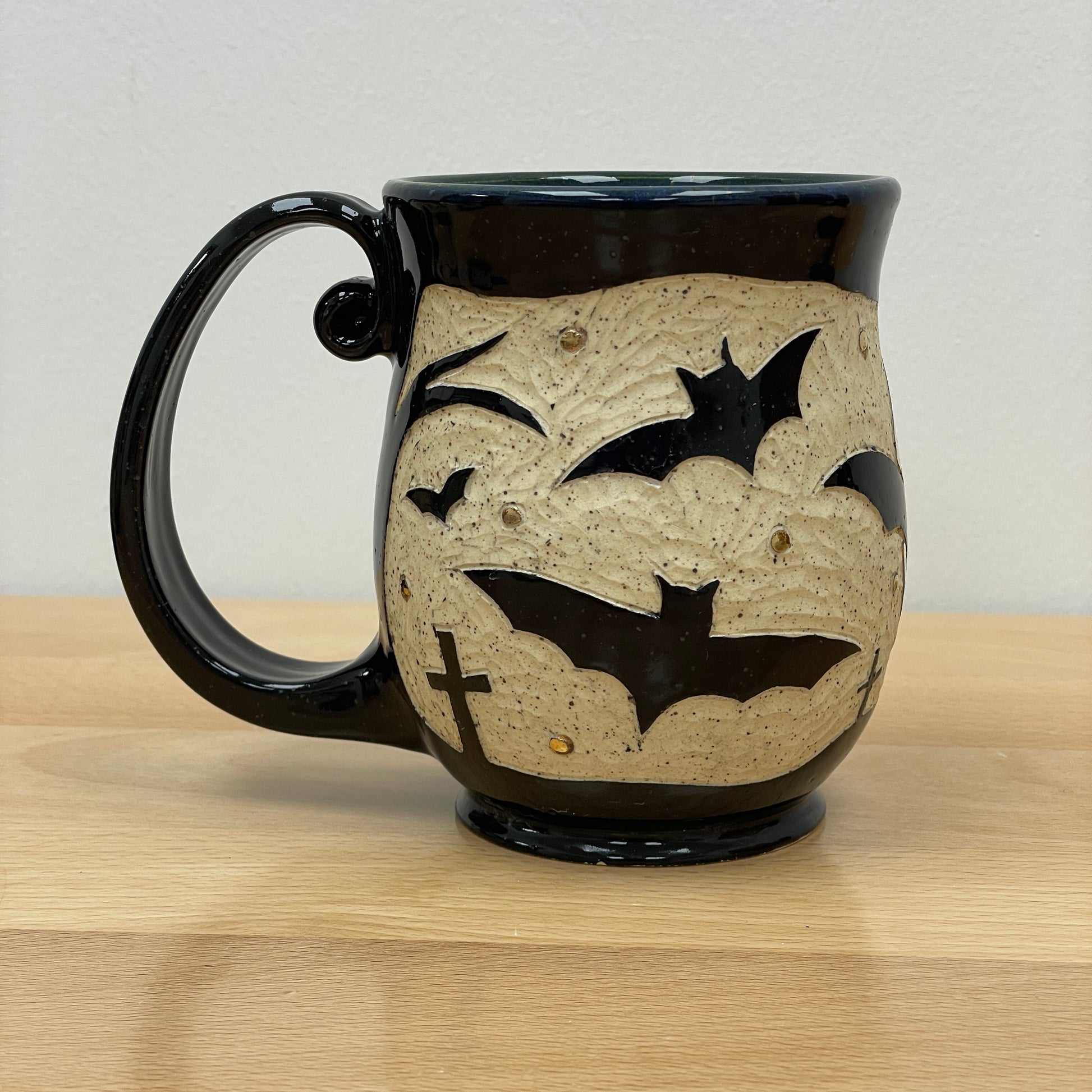 This mug was thrown on the wheel. Once dry enough, it was trimmed and the handle was formed and attached. Then black underglaze was added and carved away to make the halloween design. After it was bone dry, it was bisque fired, then glazed and fired. Then gold luster was added and the mug was fired one last time to this finished product.