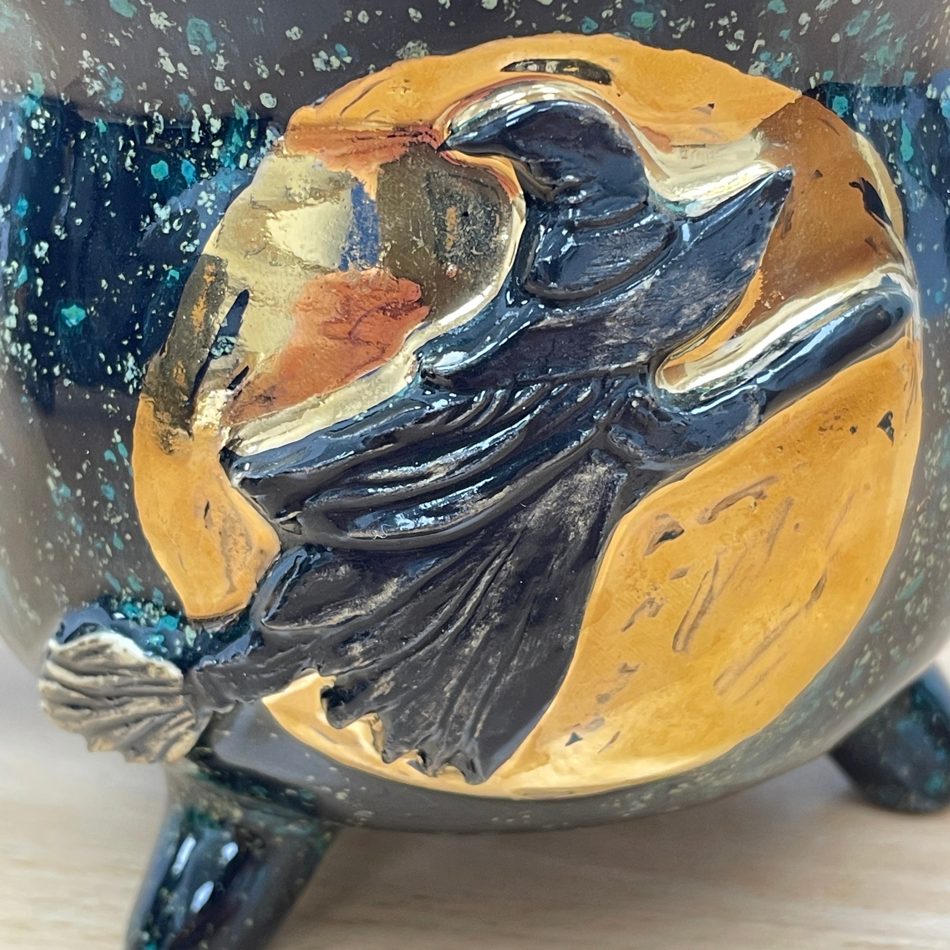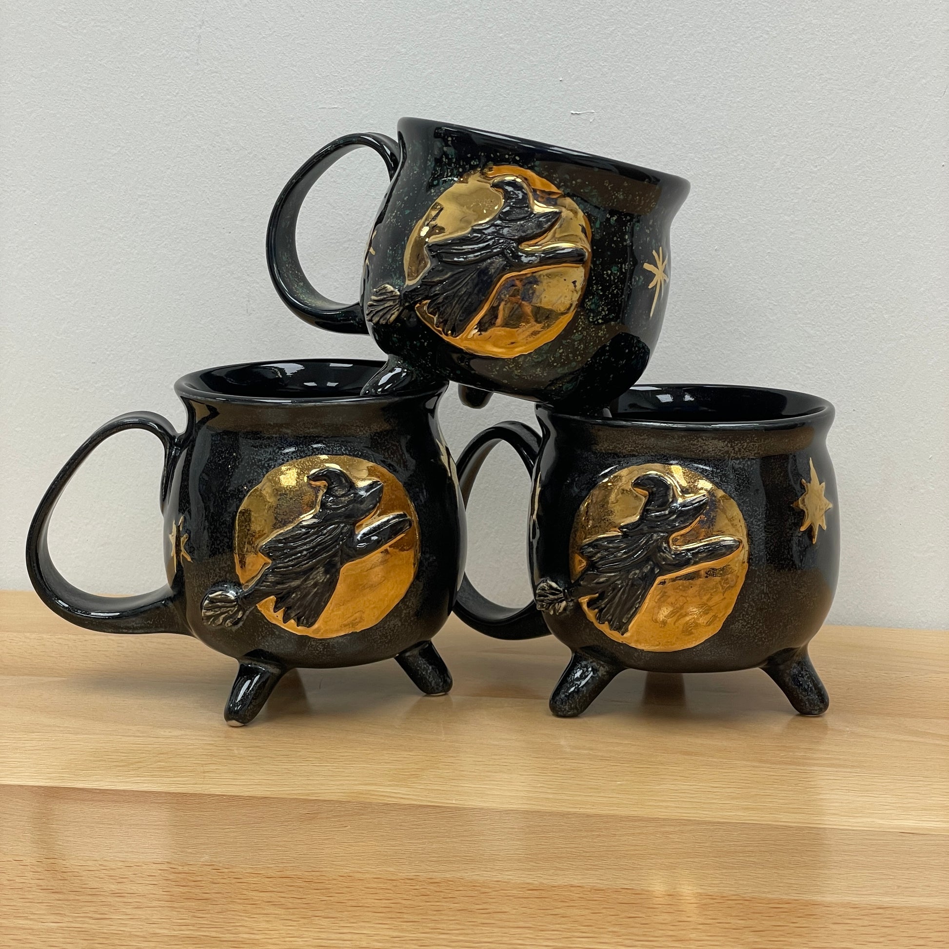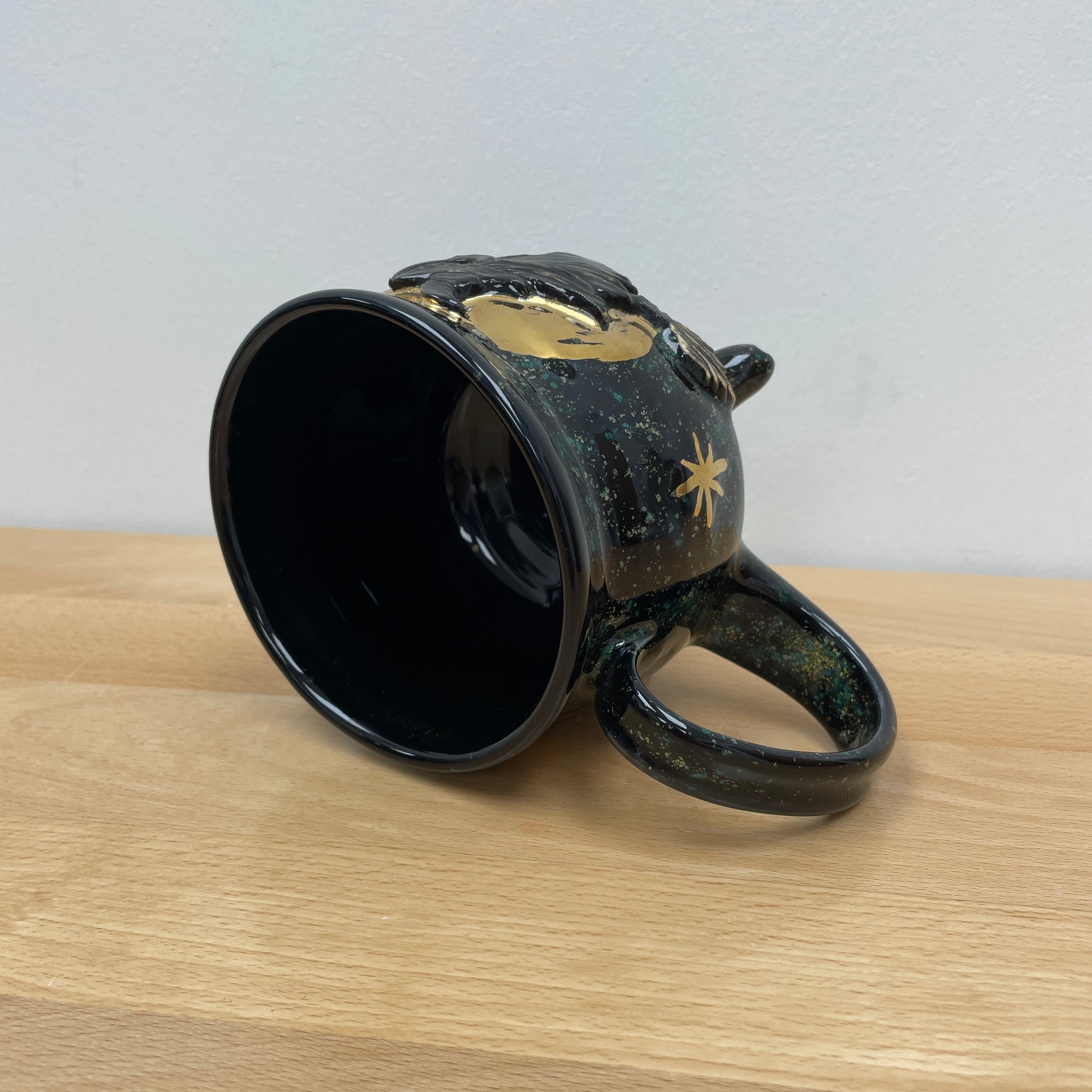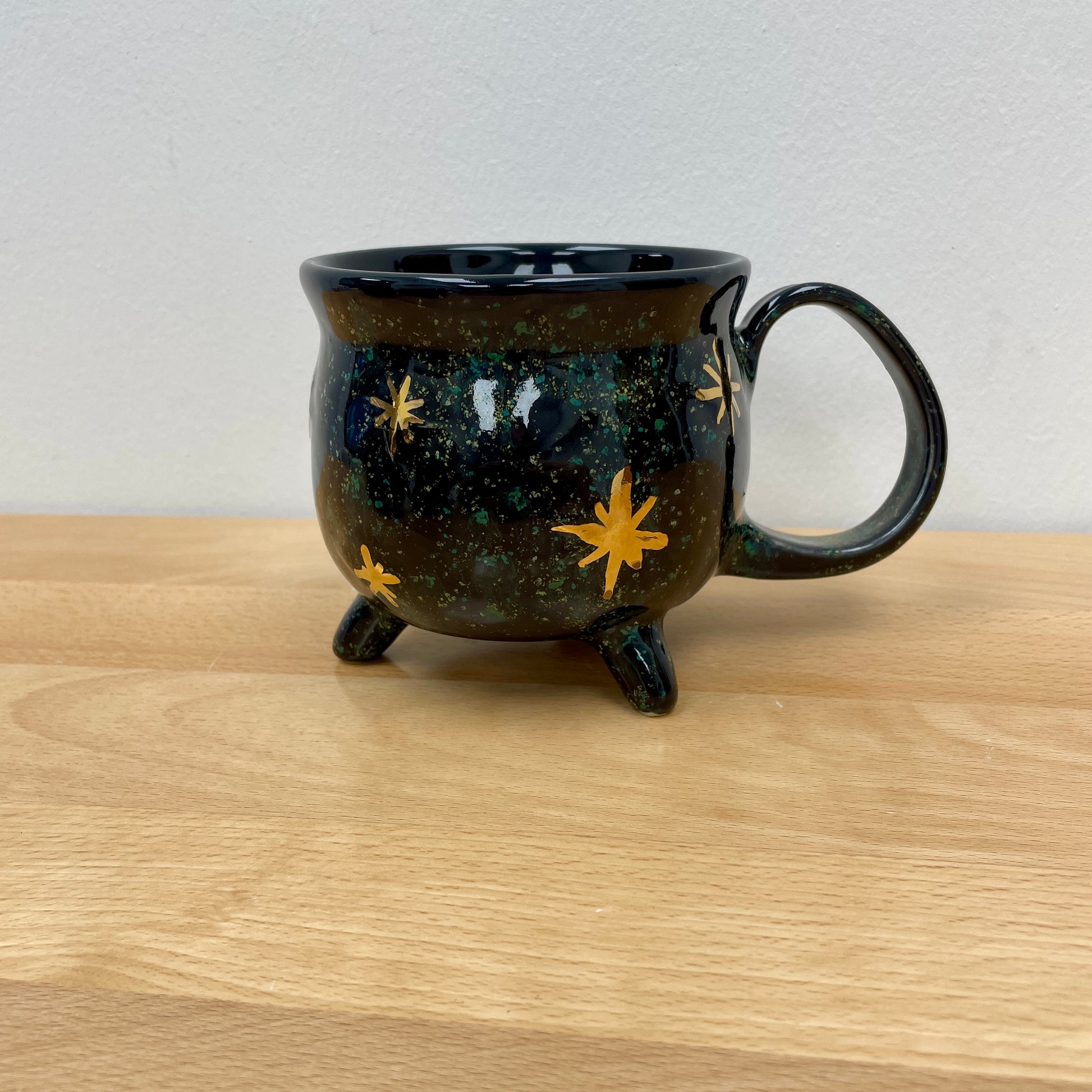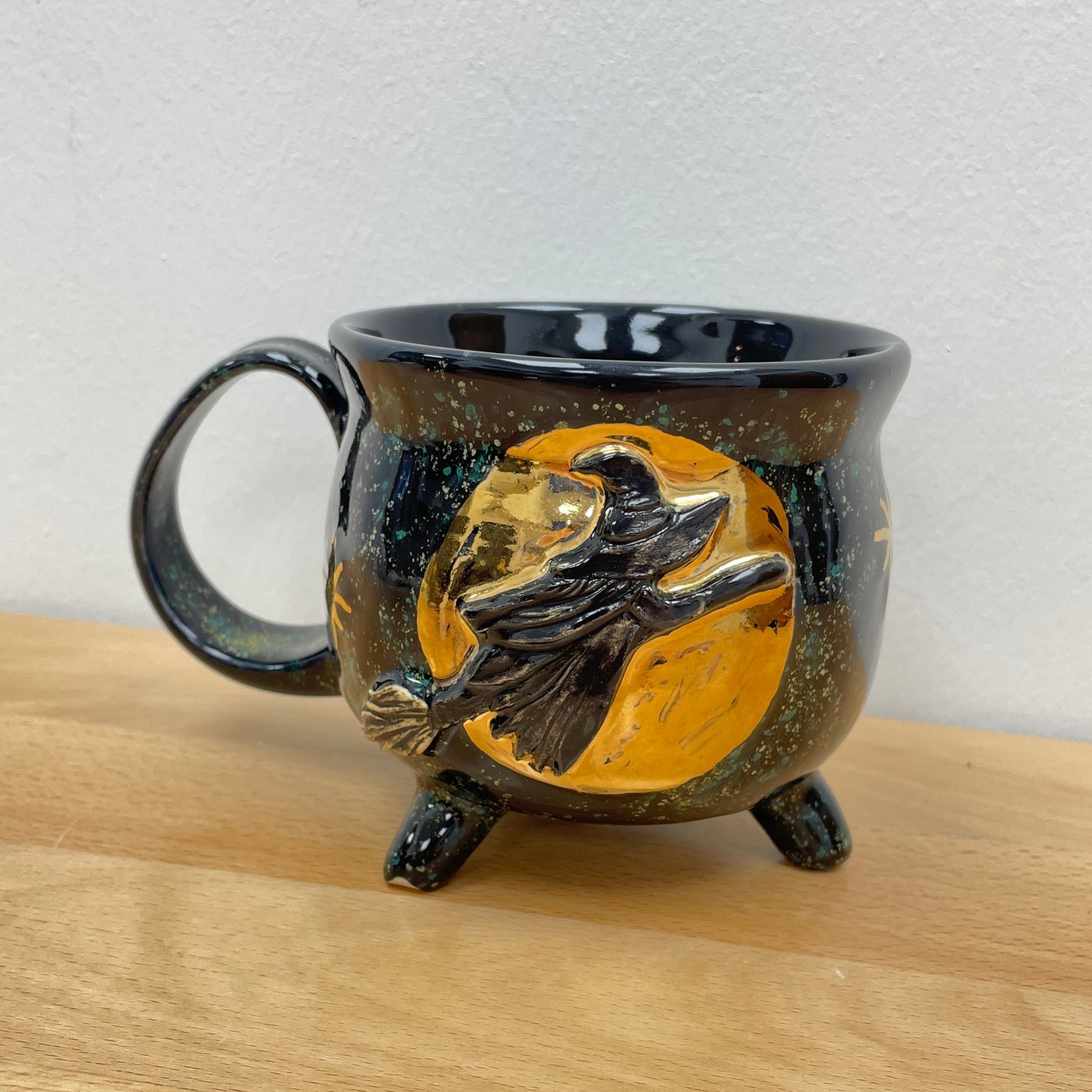 This mug was thrown on the wheel. Once dry enough, it was trimmed and the handle and feet were formed and attached. The witch was added and the stars were carved out. After it was bone dry, it was bisque fired, then glazed and fired. Then gold luster was added and the mug was fired one last time to this finished product.